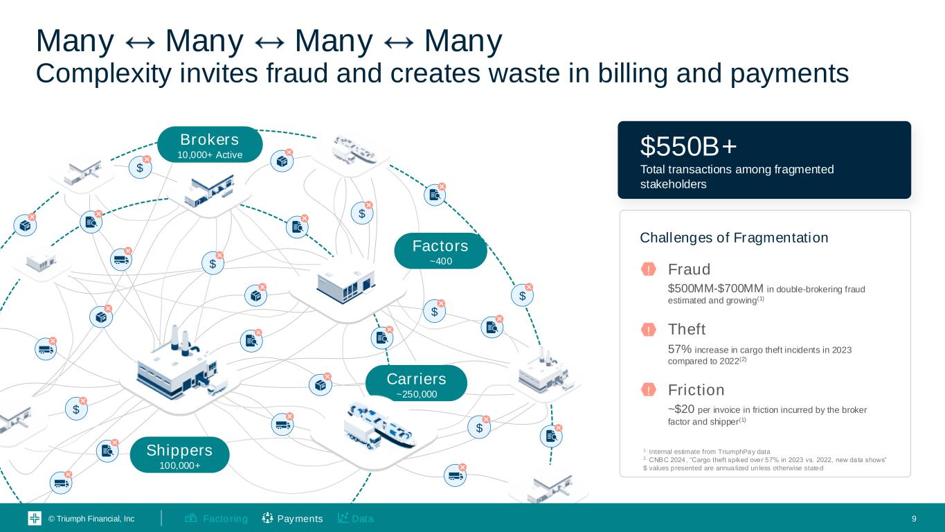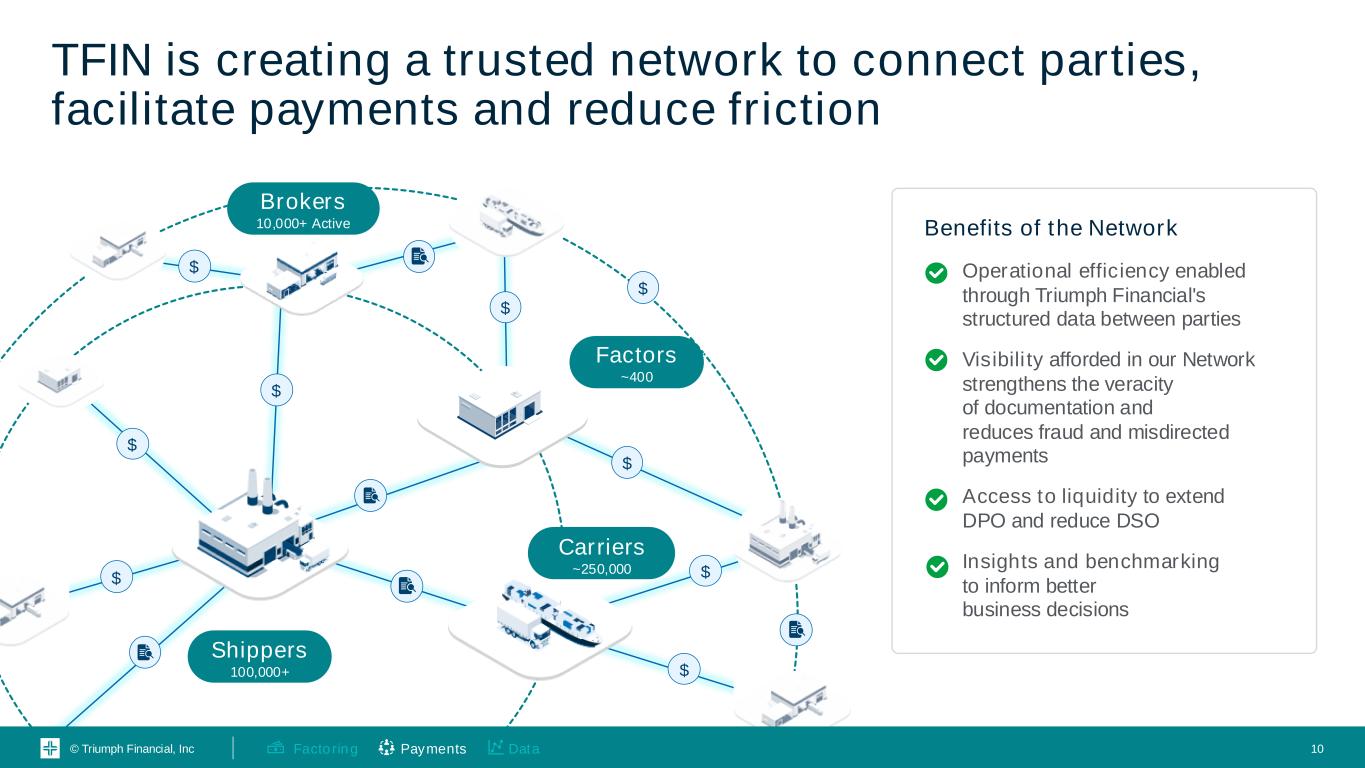 © Triumph Financial, Inc Many Many Many Many Complexity invites fraud and creates waste in billing and payments Fraud $500MM-$700MM in double-brokering fraud estimated and growing(1) Theft 57% increase in cargo theft incidents in 2023 compared to 2022(2) Friction ~$20 per invoice in friction incurred by the broker factor and shipper(1) ! ! ! Challenges of Fragmentation 1. Internal estimate from TriumphPay data 2. CNBC 2024, “Cargo theft spiked over 57% in 2023 vs. 2022, new data shows” $ values presented are annualized un less otherwise stated $550B+ Total transactions among fragmented stakeholders Brokers 10,000+ Active $ $ $ $ $ $ Shippers 100,000+ Factors ~400 Carriers ~250,000 $ 9Payments DataFactoring