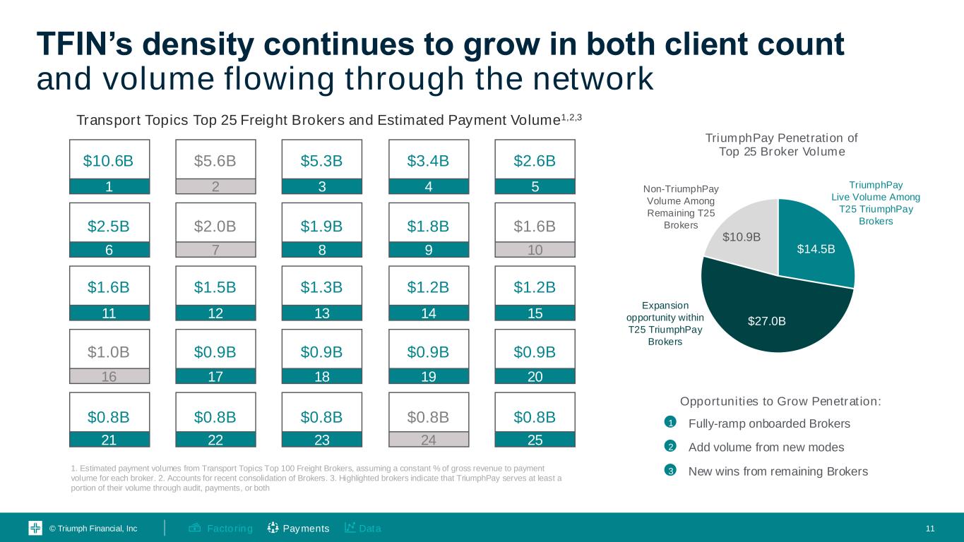 © Triumph Financial, Inc TFIN is creating a trusted network to connect parties, facilitate payments and reduce friction Shippers 100,000+ Factors ~400 Brokers 10,000+ Active $ $ $ $ $ $ $ Carriers ~250,000 10 Operational efficiency enabled through Triumph Financial's structured data between parties Visibility afforded in our Network strengthens the veracity of documentation and reduces fraud and misdirected payments Access to liquidity to extend DPO and reduce DSO Insights and benchmarking to inform better business decisions Benefits of the Network Payments DataFactoring $ $