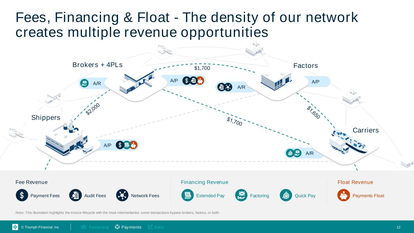 © Triumph Financial, Inc TFIN’s density continues to grow in both client count and volume flowing through the network 11Payments DataFactoring 1. Estimated payment volumes from Transport Topics Top 100 Freight Brokers, assuming a constant % of gross revenue to payment volume for each broker. 2. Accounts for recent consolidation of Brokers. 3. Highlighted brokers indicate that TriumphPay serves at least a portion of their volume through audit, payments, or both 1 6 11 16 21 2 7 12 17 22 3 8 13 18 23 4 9 14 19 24 5 10 15 20 25 $10.6B $5.6B $5.3B $3.4B $2.6B $2.5B $2.0B $1.9B $1.8B $1.6B $1.6B $1.5B $1.3B $1.2B $1.2B $1.0B $0.9B $0.9B $0.9B $0.9B $0.8B $0.8B $0.8B $0.8B $0.8B TriumphPay Live Volume Among T25 TriumphPay Brokers $14.5B $27.0B $10.9B TriumphPay Penetration of Top 25 Broker Volume Expansion opportunity within T25 TriumphPay Brokers Opportunities to Grow Penetration: Fully-ramp onboarded Brokers Add volume from new modes New wins from remaining Brokers 1 2 3 Non-TriumphPay Volume Among Remaining T25 Brokers Transport Topics Top 25 Freight Brokers and Estimated Payment Volume1,2,3
