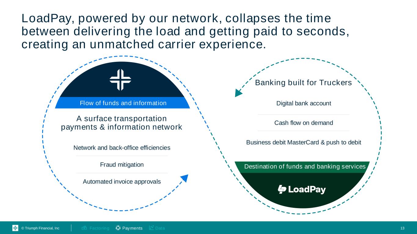 © Triumph Financial, Inc LoadPay, powered by our network, collapses the time between delivering the load and getting paid to seconds, creating an unmatched carrier experience. 13Payments DataFactoring A surface transportation payments & information network Network and back-office efficiencies Fraud mitigation Automated invoice approvals Banking built for Truckers Digital bank account Cash flow on demand Business debit MasterCard & push to debit Flow of funds and information Destination of funds and banking services