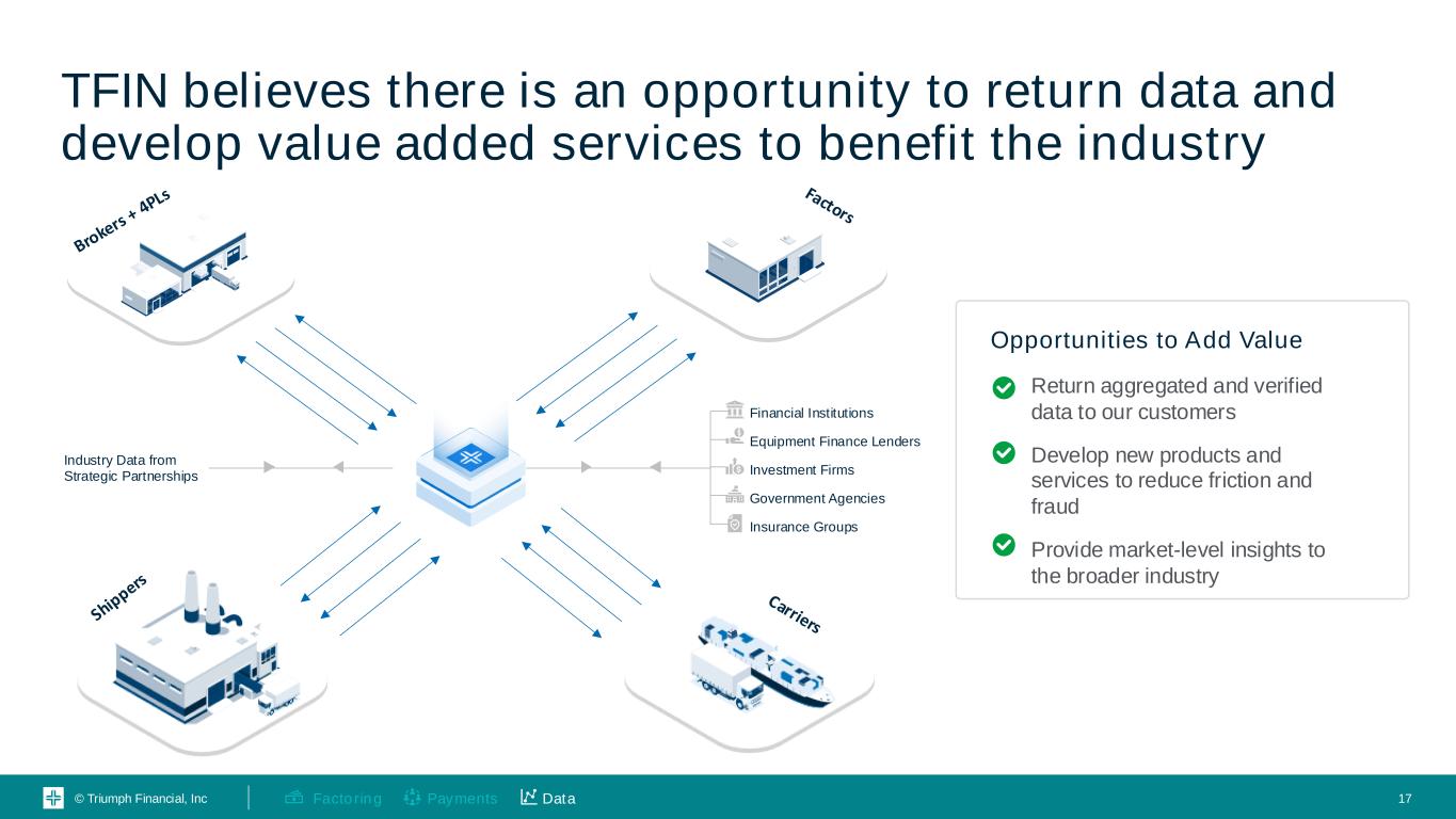 © Triumph Financial, Inc 16 The TFIN Network and assets uniquely position us to offer visibility into accurate, actionable data 01 02 03 Density Neutrality Veracity • We touch ~50% of all brokered freight invoices • We make $38B+ in transportation payments1 • We are a publicly traded bank • We move data and money (not freight), so we are not a competitive threat to the industry we serve • We receive data on real, cleared, verified transactions (e.g. not from potential or proposed loads) • Our network directly connects core systems of record Payments DataFactoring 1. Inclusive of TFIN’s factoring payments