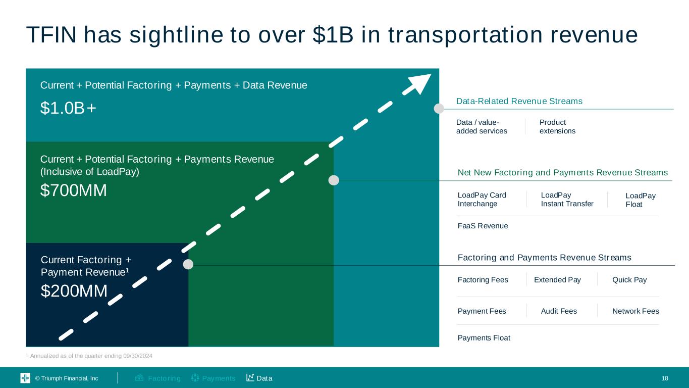 © Triumph Financial, Inc TFIN believes there is an opportunity to return data and develop value added services to benefit the industry 17 Financial Institutions Equipment Finance Lenders Investment Firms Government Agencies Insurance Groups Industry Data from Strategic Partnerships Payments DataFactoring Return aggregated and verified data to our customers Develop new products and services to reduce friction and fraud Provide market-level insights to the broader industry Opportunities to Add Value