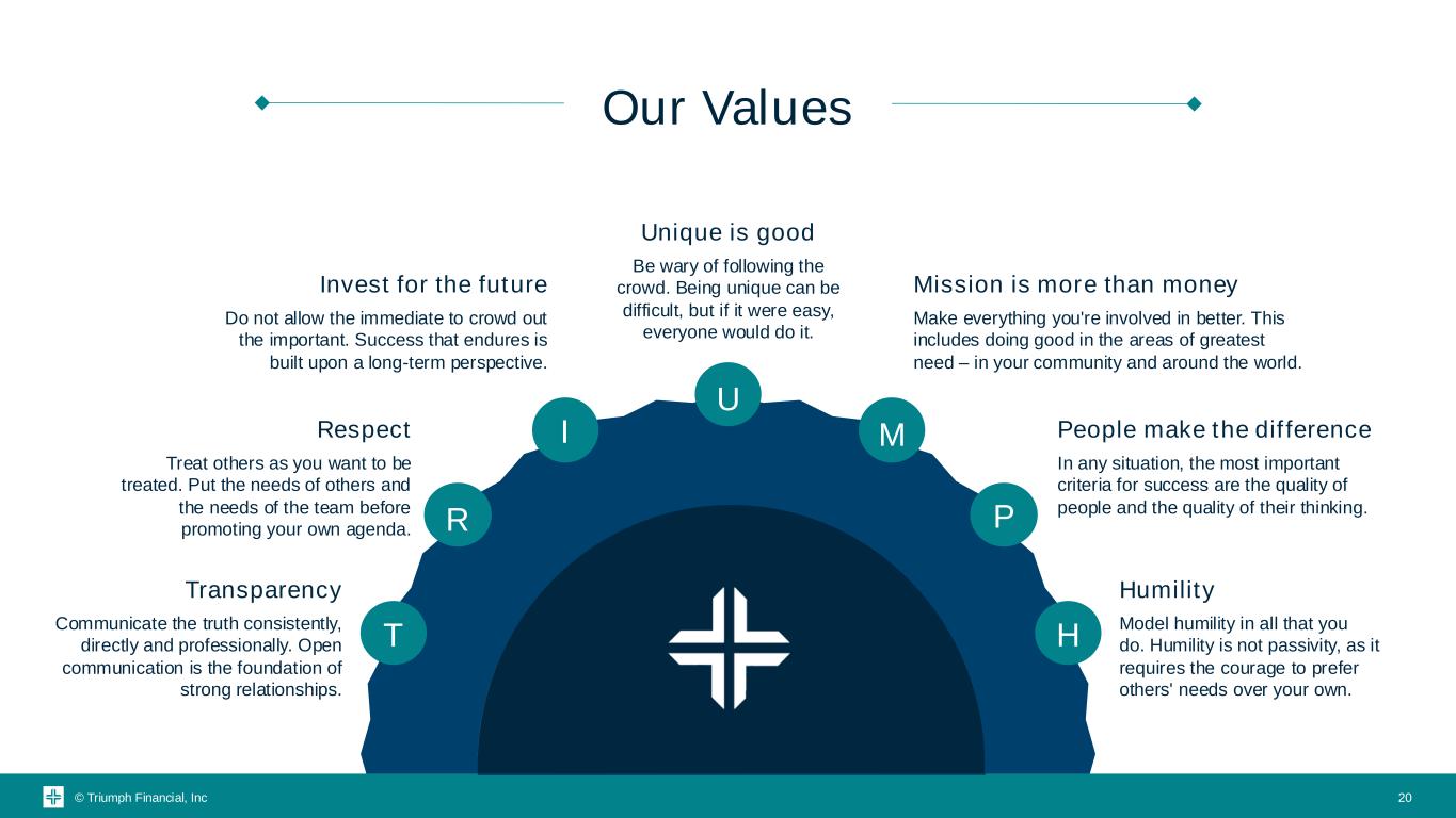 © Triumph Financial, Inc Transparency Communicate the truth consistently, directly and professionally. Open communication is the foundation of strong relationships. Respect Treat others as you want to be treated. Put the needs of others and the needs of the team before promoting your own agenda. Invest for the future Do not allow the immediate to crowd out the important. Success that endures is built upon a long-term perspective. Unique is good Be wary of following the crowd. Being unique can be difficult, but if it were easy, everyone would do it. Mission is more than money Make everything you're involved in better. This includes doing good in the areas of greatest need – in your community and around the world. People make the difference In any situation, the most important criteria for success are the quality of people and the quality of their thinking. Humility Model humility in all that you do. Humility is not passivity, as it requires the courage to prefer others' needs over your own. Our Values 20 T MI R P H U