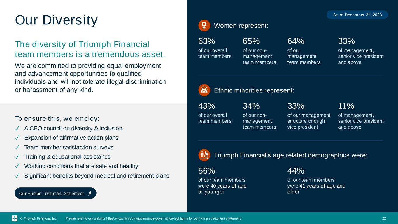 © Triumph Financial, Inc Our Environmental Practices What we Believe What we Monitor We recognize that our activities may have an impact on our planet We are committed to sustainable finance, balancing environmental stewardship with responsible business operations and complying with all applicable laws We focus our efforts on responsible resource use while creating comfortable, safe and healthy workplaces for our team members and stakeholders Limits set on concentrations of certain types of lending or industries The company requires Board oversight and approval of relationships exceeding certain thresholds The company employs external loan review and between 70% and 75% of the portfolio is reviewed annually The company stress tests the portfolio regularly and evaluates whether climate change loss factors should be included in credit loss forecasting Our ESG Report Our ESG Report Our Environmental Policy Our Environmental Policy What we Practice ✓ Preference for environmentally friendly products ✓ Leverage document and image technology to reduce paper consumption, our largest waste product ✓ Newest branch operates solar panels and geothermal heat pumps ✓ New offices use LED lighting and occupancy sensors. Existing branches are being upgraded 21Please refer to our website https://www.tfin.com/governance/esg for our ESG report and to https://www.tfin.com/governance/governance-highlights for our environmental policy.