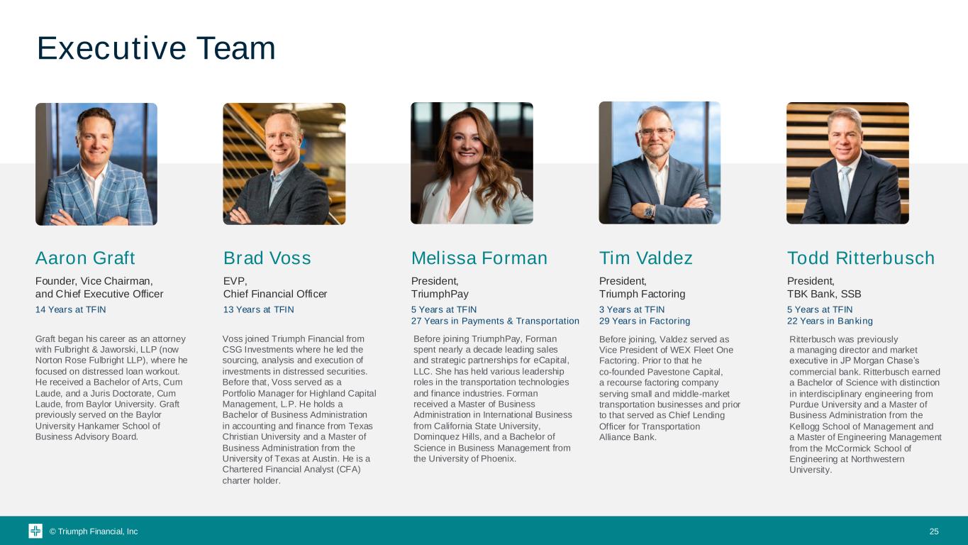 © Triumph Financial, Inc Executive Team Aaron Graft Founder, Vice Chairman, and Chief Executive Officer 14 Years at TFIN Brad Voss EVP, Chief Financial Officer 13 Years at TFIN Melissa Forman President, TriumphPay 5 Years at TFIN 27 Years in Payments & Transportation Tim Valdez President, Triumph Factoring 3 Years at TFIN 29 Years in Factoring Todd Ritterbusch President, TBK Bank, SSB 5 Years at TFIN 22 Years in Banking Graft began his career as an attorney with Fulbright & Jaworski, LLP (now Norton Rose Fulbright LLP), where he focused on distressed loan workout. He received a Bachelor of Arts, Cum Laude, and a Juris Doctorate, Cum Laude, from Baylor University. Graft previously served on the Baylor University Hankamer School of Business Advisory Board. Voss joined Triumph Financial from CSG Investments where he led the sourcing, analysis and execution of investments in distressed securities. Before that, Voss served as a Portfolio Manager for Highland Capital Management, L.P. He holds a Bachelor of Business Administration in accounting and finance from Texas Christian University and a Master of Business Administration from the University of Texas at Austin. He is a Chartered Financial Analyst (CFA) charter holder. Before joining TriumphPay, Forman spent nearly a decade leading sales and strategic partnerships for eCapital, LLC. She has held various leadership roles in the transportation technologies and finance industries. Forman received a Master of Business Administration in International Business from California State University, Dominquez Hills, and a Bachelor of Science in Business Management from the University of Phoenix. Before joining, Valdez served as Vice President of WEX Fleet One Factoring. Prior to that he co-founded Pavestone Capital, a recourse factoring company serving small and middle-market transportation businesses and prior to that served as Chief Lending Officer for Transportation Alliance Bank. Ritterbusch was previously a managing director and market executive in JP Morgan Chase’s commercial bank. Ritterbusch earned a Bachelor of Science with distinction in interdisciplinary engineering from Purdue University and a Master of Business Administration from the Kellogg School of Management and a Master of Engineering Management from the McCormick School of Engineering at Northwestern University. 25