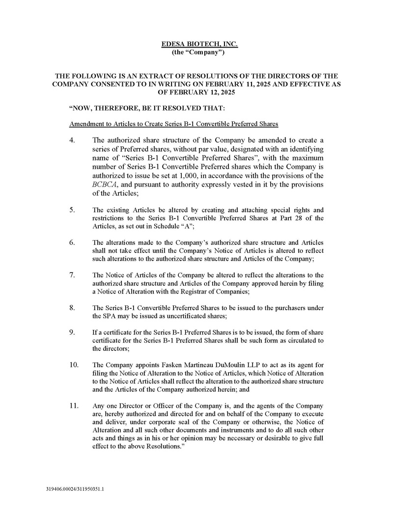 EDESA BIOTECH, INC. (the “Company”) THE FOLLOWING IS AN EXTRACT OF RESOLUTIONS OF THE DIRECTORS OF THE COMPANY CONSENTED TO IN WRITING ON FEBRUARY 11, 2025 AND EFFECTIVE AS OF FEBRUARY 12, 2025 “NOW, THEREFORE, BE IT RESOLVED THAT: Amendment to Articles to Create Series B - 1 Convertible Preferred Shares 4. 319406.00024/311950351.1 The authorized share structure of the Company be amended to create a series of Preferred shares, without par value, designated with an identifying name of “Series B - 1 Convertible Preferred Shares”, with the maximum number of Series B - 1 Convertible Preferred shares which the Company is authorized to issue be set at 1 , 000 , in accordance with the provisions of the BCBCA , and pursuant to authority expressly vested in it by the provisions of the Articles ; 5. The existing Articles be altered by creating and attaching special rights and restrictions to the Series B - 1 Convertible Preferred Shares at Part 28 of the Articles, as set out in Schedule “A” ; 6. The alterations made to the Company’s authorized share structure and Articles shall not take effect until the Company’s Notice of Articles is altered to reflect such alterations to the authorized share structure and Articles of the Company ; 7. The Notice of Articles of the Company be altered to reflect the alterations to the authorized share structure and Articles of the Company approved herein by filing a Notice of Alteration with the Registrar of Companies ; 8. The Series B - 1 Convertible Preferred Shares to be issued to the purchasers under the SPA may be issued as uncertificated shares; 9. If a certificate for the Series B - 1 Preferred Shares is to be issued, the form of share certificate for the Series B - 1 Preferred Shares shall be such form as circulated to the directors ; 10. The Company appoints Fasken Martineau DuMoulin LLP to act as its agent for filing the Notice of Alteration to the Notice of Articles, which Notice of Alteration to the Notice of Articles shall reflect the alteration to the authorized share structure and the Articles of the Company authorized herein ; and 11. Any one Director or Officer of the Company is, and the agents of the Company are, hereby authorized and directed for and on behalf of the Company to execute and deliver, under corporate seal of the Company or otherwise, the Notice of Alteration and all such other documents and instruments and to do all such other acts and things as in his or her opinion may be necessary or desirable to give full effect to the above Resolutions . ”