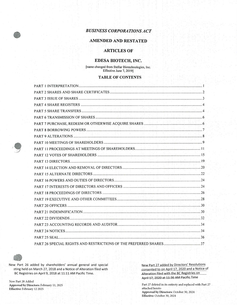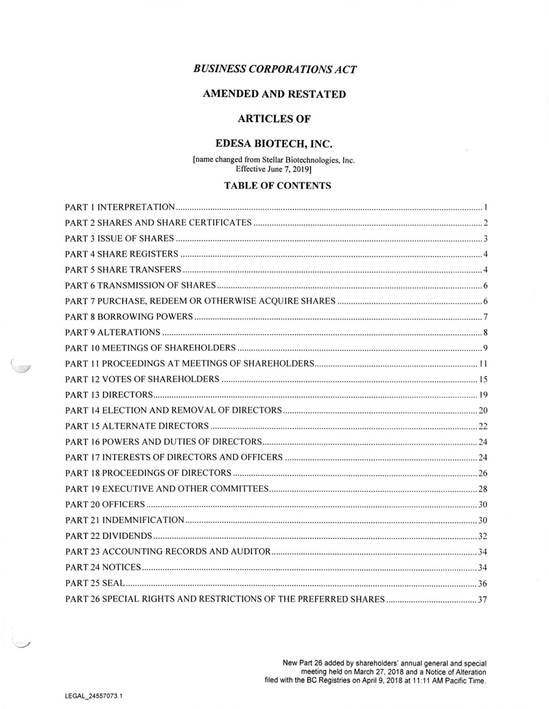 BUS/NESS CORPORATIONS ACT AMENDED AND RESTATED ARTICLES OF EDESA BIOTECH, INC. [name changed from Stellar Biotechnologies, Inc . Effective June 7 , 2019] TABLE OF CONTENTS PART I INT E RPRETATION ........................... . .............. . .... . .. .. ................... ... ........ .... . . ...... . .. . ........... .. . ..... .. ................ I PART 2 S HARE S AND SHARE CE RTIFICAT ES .. . ............. . ............................ . ....................................................... 2 PART 3 ISSUE OF SHARES ................................. .......... .... ............. .. .. .. ........... . .. ...... . . ...... . ......... . . .... ... ............. .. . ...... 3 PART 4 SHARE REGISTERS . . ....................... . ................ ... .. . .. .. .. . .............. . .... .. .... . .... . . .. .. . . . .............. . . .... .. . ................ 4 PART 5 SHARE TRANSFERS . ................... .. ............. . ..... . . . ..... . .............. .. . . ... . . . ............. .. .. .. ........ .. .. . . . ... . .................... 4 PART 6 TRANSMISSION OF SHARES ................ ..... ......... .. ...... ....... ............ .. . . .. . ........ . ... . ...... . ............... . ....... . ......... 6 PART 7 PURCHAS E, REDEEM OR OTHERWISE ACQUIRE SHARES ......... . .......... . . .. . . . .... ........... ..... .... .... .. .. ..... 6 PART 8 BORROWING POW E RS .. . . . . . ..... . ... .... .. . ... . .. .. .. . ... ... .... .... ...... . .... ....... . . .. . . .. .. . . ..... ... . .. .... . .................... . ... ..... .... 7 PART 9 ALTERA TIONS .. . ..... .. .. ....... ....... . . .. ....... ..... .............. .. ... ... . ...... . ..... . ... . . . ...... . .. ................ ...... .. ... . .................. . . 8 PART 10 MEETINGS OF SHAREHOLDERS ........ . .... .. ..... ........................... ................ . . . ............ .. ..... . ...................... 9 PART 11 PROCEEDINGS AT MEETINGS OF SHAREHOLDERS ......... . ............... . ... .......... . ...... .... ........... ...... ..... 11 PART 12 VOTES OF SHAREHOLDERS ...... .. .................. . ............ . .. . . ... . . . . .............................................................. 15 PART 13 DIRECTORS . .............. . ...... .. .... . ....... ........ ........... . ..... . ...... . ... .... . . .. . .. . . . ......... .... .... .... ..... ... .............. . ... .......... 19 PART 14 ELECTION AND REMOVAL OF DIR ECTO RS ...... . .......... ... .... .... . .... . . .. .... . ...... . .............. . .. . ...... . ..... .. ..... 20 PART 15 ALTERNATE DIRECTORS . .......... . . . ............ ..... .. ...... .. .. ... . .. ... . ......................... . .... . ......... . ............ . ........ . .. 22 PART 16 POW E RS AND DUTI ES OF DIRECTORS ... ......... .. ....................... . ......... .. ... . ........................... .. ............. 24 PART 17 INTERESTS OF DIR ECTO RS AND OFFICERS ... ..... . ......... . . . ... . ... ...... ... . . ........ . ... .. ......... ... . ................... 24 PART 18 PROCEEDINGS OF DIRECTORS ..... ............ ... ....... ... ... . . ... .... . ......................... .. ....... . ............... .... .. .... . . ... 26 PART 19 EXECUTIVE AND OTHER CO MMITT EES .................... .. ............. . ........................................................ 28 PART 20 OFFICERS .... . ................... . . .. .. ..... ... . ............... . . .. . ... ... . .................................... .. ...... . .. ...... ...... .................. ... 30 PART 21 INDEMNIFICATION ... . ... . ............... . ..... . .......................................... . ........................................................ 30 PART 22 DIVIDENDS .... .... ........ .................. .. .......... .. .. . .............. .. ....... .. ... . ..... . ... ..... . ..... .. ......... ........... . ............. . ...... 32 PART 23 ACCOUNTING RECORDS AND AUDITOR ...... . ........... .. . ....... ... .... ..... .................. .... . .. ... . ............... ....... 34 PART 24 NOTICES ...... .......... . ....... .... . .. .. . ................... . ... . .. . ................. . ............. .. ...................................... . ......... . ..... 34 PART 25 SEAL ... . .. . ....... . .. .. . . ......... ... . . ..... . ......... . . .. .. ......... . .. ............... .. ..... .. .................. . .... ......... ... . ........ .. . .. . ... . ... . ..... 36 PART 26 SPECIAL RIGHTS AND RESTRICTIONS OF THE PREFERRED SHARES .. .... ... ............................... 37 New Part 26 added by shareho l ders ' annual general and special meeting held on March 27 , 2018 and a Notice of Alteration filed with the BC Registries on April 9, 2018 at 11 : 11 AM Pacific Time . LEGAL_245570 73.1