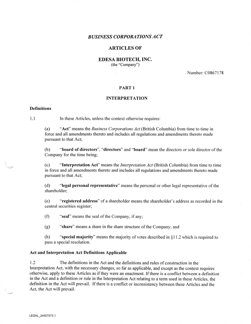 LEGAL_245570 7 3 . 1 BUSINESS CORPORATIONS ACT ARTICLES OF EDESA BIOTECH, INC. (the "Company") Number : C0867 l 78 PART 1 INTERPRETATION Definitions I. I In these Articles , unless the context otherwise requires: (a) " Act " means the Business Corporations Act (British Columbia) from time to time in force and all amendments thereto and includes all regulations and amendments thereto made pursuant to that Act ; (b) " board of directors ", " directors " and " board " mean the directors or sole director of the Company for the time being ; (c) " Interpretation Act " means the Interpretation Act (British Columbia) from time to time in force and all amendments thereto and includes all regulations and amendments thereto made pursuant to that Act ; (d) " legal personal representative " means the personal or other le g al repre s entati v e of the shareholder ; (e) " registered address " of a shareholder means the shareholder ' s address as recorded in the central securities register ; (f) " sea l " means the s eal of the Company , if any ; (g) " share " means a s hare in the share structure of the Company ; and (h) " specia l majority " means the majority of votes described in † 11 . 2 which is required to pass a special resolution. Act and Interpretation Act Definitions Applicable 1.2 The definitions in the Act and the definitions and rules of construction in the Interpretation Act , with the necessary changes, so far as applicable, and except as the context requires otherwise, apply to these Articles as if they were an enactment. If there is a conflict between a definition in the Act and a definition or rule in the Interpretation Act relating to a term used in these Articles , the definition in the Act will prevail. If there is a conflict or inconsistency between these A1ticles and the Act , the Act will prevail.