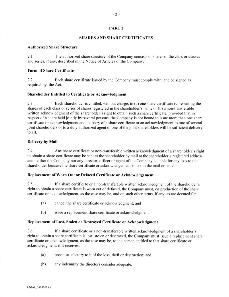 L EGAL _24557073 . 1 - 2 - PART2 SHARES AND SHARE CERTIFICATES Authorized Share Structure 1. Th e a uth o ri ze d s hare s tru c tur e o f th e Co mp a n y co n s i s t s o f s har es of th e c l ass o r c l asses and se rie s, i f a n y, d esc rib e d in th e N o ti ce o f A r t i c l es of th e Co mpan y. Form of Share Certificate 2. Eac h s h a r e ce rtifr :a te i ss u e d b y th e Co mp a n y mu s t c o mpl y w ith , a nd b e s i g n e d as r e quir e d b y, th e Ac t. Shareholder Entitled to Certificate or Acknowledgment 3. Eac h s h a r e h o lder i s e ntitl e d , w ith o ut c h a r ge , t o ( a) o n e s h a r e ce r t ifi ca t e r e pr ese ntin g t h e s h a r es of eac h c l ass o r se ri es of s h a r es r eg i s t e r e d in th e s h a r e h o ld e r 's n a m e o r ( b ) a n o n - tr a n sfera bl e w ritt e n a c kn ow l e d g m e nt of th e s har e h o ld e r ' s ri g ht to o b ta in s u c h a s h a r e ce r t i fica t e , p rov id e d th at in r es p ec t o f a s h a r e h e ld j o intl y b y seve ral p e r so n s , th e Co mp a n y i s n o t b o und t o i ss u e m o r e th a n o n e s h a r e c e rtifi c at e o r a c kn ow l e d g m e nt and d e li ve r y of a s h a r e ce rtifi ca t e o r an ac kn ow l e d g m e n t t o o n e o f severa l j o int s har e h o ld e r s o r t o a dul y a uth o ri ze d a ge nt of o n e of th e j o int s h a r e h o ld e r s w i 11 b e s u ffic i e nt d e li ve r y t o a l I. Delivery by Mail 4. A n y s har e ce rtifi c at e o r n o n - t ra n sfe r a bl e w ritt e n ac kn ow l e d g m e nt of a s h a r e h o ld e r ' s ri g ht t o o bt a in a s h are ce r t ifi ca t e m ay b e se nt t o th e s h a r e h o ld e r b y m a il a t th e s h a r e h o ld e r ' r eg i stere d a ddr ess a nd n e ith e r th e Co mp a n y n o r a n y dir ec t o r , office r o r age n t of th e Co mp a n y i s li a bl e fo r a n y l oss to th e s h a r e h o ld e r b eca u se th e h a r e ce r t ifi cate o r ac kn ow l e d ge m e nt i l os t in th e m a il o r s t o l e n . Replacement of Worn Out or Defaced Certificate or Acknowledgement 5. If a s h a r e ce rtifi c, t t e o r a n o n - t ra n sfera bl e w ritt e n ac kn ow l e d g m e nt o f th e s h a r e h o ld e r ' s ri g ht t o o bt a in a s h a r e ce rtifi ca t e i s w o rn o ut o r d eface d , th e Co mp a n y mu s t , o n p ro du c ti o n o f th e s h a r e c e rtifi ca t e o r ac kn ow l e d g m e nt , as th e case m ay b e , a nd o n s u c h o th e r t e rm s, if a n y , as a r e d ee m e d tit : (a) ca n ce l th e s har e ce rtific a t e o r ac kn ow l e d g m e nt ; a nd (b) i ss u e a r e pl ace m e nt s h a r e ce r t ifi ca t e o r ac kn ow l e d g m e n t. Replacement of Lost , Stolen or De s troyed Certificate or Acknowledgment 6. I f a s h a r e ce rtifi c ate o r a n o n - tran sfe r a bl e w ritt e n ackn ow l e d g m e nt o f a s h a r e h o ld e r 's ri g ht t o o bt a in a h a r e ce 1tifi c at e i s l os t , s t o l e n o r d es t roye d , th e Compan y mu s t i ss u e a r e pl ace m e nt s h a r e ce 1 t ifi ca t e o r ac kn ow l e d g m e nt , as th e c a se m ay b e , t o th e p e r so n e ntitled t o that s h a r e ce rtifi cate o r a c kn ow l e d g m e nt , i f it r ece i ves: (a) pro o f sa ti s fa c t o ry t o it of th e l oss, th e ft o r d es truction ; and (b) a n y ind e mni ty th e dir ec t o r s co n s id e r a d e qu a t e.