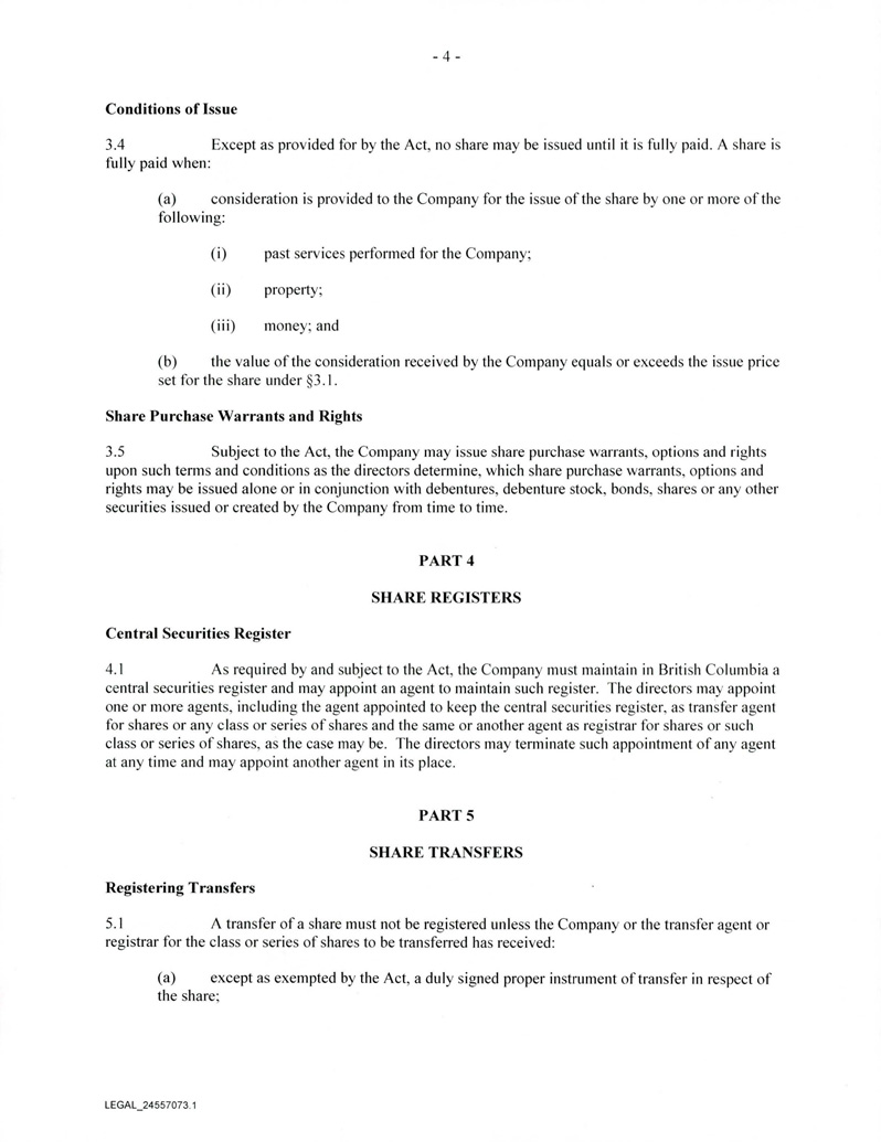 L EGAL _24557073 . 1 - 4 - Conditions of Issue 4. Exce pt as pro v id e d fo r b y th e Ac t , n o s h a r e m ay b e i ss u e d until it i s full y p a id . A s h a r e i s full y paid wh e n : (a) c o n s id e rati o n i s pro v id e d t o t h e Co mp a n y fo r th e i ss u e of th e s har e b y o n e o r m o r e o f t h e fo ll ow in g : (i) p as t se r v i ces p e r fo rm e d fo r th e Co mp a n y; (ii) p ro p e 1 ty; (iii) m o n ey; a nd (b) th e valu e o f th e c on s id e rati o n r ece i ve d b y th e Co mp a n y e qu a l s o r excee d s th e i ss u e pri ce se t fo r th e s h a r e und e r † 3 . I . Share Purchase Warrants and Rights 5. S ubj ec t t o th e Ac t , th e Co mp a n y m ay i ss u e s h a r e purch ase wa rrant s, o pti o n s a nd ri g ht s up o n s uch term s a nd co nditi o n s as th e dir e ct o r s d e t e rmin e, w hi c h s h a r e pu rc h ase wa rrant s , o pti o n s a nd ri g ht s m ay b e i ss u e d a l o n e o r in co njun c ti o n w ith d e b e ntur es , d e b e ntur e s t oc k , b o nd s , s h a r es o r a n y o th e r sec uriti es i ss u e d o r c r ea t e d b y t h e Co mp a n y fr o m tim e t o tim e . PART4 SHARE REGISTERS Central S e curities Re g ister 4. 1 As r e quir e d b y a nd s ubj ec t t o t h e Ac t , th e Co mp a n y mu s t m a int a in in Briti h Co lumbi a a ce nt ra l sec uriti es r eg i ste r a nd m ay a pp o in t a n age nt t o m a int a in s u c h r eg i ste r. T h e dir ec t o r s m ay a pp o in t o n e o r m o r e age nt s, in c ludin g th e age nt a pp o int e d t o k ee p th e ce nt ra l sec uriti es r eg i s t e r , as t ran sfe r age nt fo r s h a r es o r a n y c l ass o r se ri es of s h a r es a nd th e sa m e o r an o th e r age nt as r eg i s trar fo r s h a r es o r s u c h c l ass o r se ri es o f s h a r es , as th e case m ay b e. Th e dir ec t o r s m ay t e rmin a t e s u c h a pp o intm e nt o f a n y age nt at a n y tim e a nd m ay a pp o int a n o th e r age nt in it s pl ace. PARTS SHARE TRANSFERS Registering Tran s fer s 1. ! \ tran sfe r o f a s h a r e mu s t n ot b e r eg i s t e r e d unl ess th e Comp a n y o r th e tran sfe r age nt o r reg i s trar fo r th e c l ass o r se ri es o f s h a r es t o b e tran s ferr e d h as r e c e i ve d : (a) exc ept as exe mpt e d b y th e Ac t , a dul y s i g n e d proper in s trum e nt o f tran sfe r in r es p ec t o f th e s h a r e ;