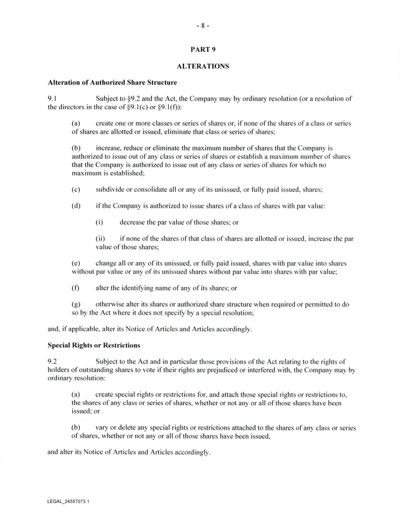 L EGAL _24557073 . 1 - 8 - PART9 ALTERATION S Alteration of Authorized Share Structure 1. S ubj ec t t o † 9 .2 a nd th e A c t , th e Co mp a n y m ay b y o rdin a r y r eso luti o n (o r a r eso luti o n of th e dir ec t o r s in th e case o f † 9 . l (c) o r † 9. l (t)): (a) c r ea t e o n e o r m o r e c l asses or se r ies of s h a r es o r , i f n o n e of th e s h a r es o f a c l ass or se ri e s of s h a r es a r e a ll o tt e d o r i ss u e d , e lim inat e that c l ass o r se ri es of s h a r es ; (b) incr e a se , r e duc e o r e limin a t e th e ma x imum numb e r o f s h a r es th a t th e Co mp a n y i s a uth o ri ze d t o i ss u e o ut o f a n y c l ass o r se ri es o f s h a r e s o r es t a bli s h a m ax imum numb e r of s h a r es th a t th e Co mp a n y i s a uth o ri ze d t o i ss u e o ut of a n y c l ass o r se ri es of s h a r es fo r whi c h n o m ax imum i s esta bli s h ed ; (c) s ubdi v id e o r co n so lid a t e a ll o r a n y of i ts uni ss u e d , o r full y p a id i ss u e d , s h a r es ; (d) if th e Co mpan y i s a uth o ri ze d t o i ss u e s h a r es of a c l ass of s h a r es w ith p a r va lu e: (i) d ec r ease th e p a r va lu e of th ose s h a r es ; o r (ii) i f n o n e of th e s h a r es o f th a t c l ass of s h a r es a r e a ll otte d o r i ss u e d , in c r ea s e th e p a r va lu e o f t h ose s h a r es ; (e) c h a n ge a ll o r a n y of it s uni ss u e d , o r full y p a id i ss u e d , s h a r es w ith p a r va lu e int o s h a r e s w ith o ut p a r va lu e o r a n y of i ts uni s u e d s h a r es w i t h o ut p ar va lu e int o s h a r es w ith p a r va lu e ; ( t) a lt e r th e id e ntif y in g n a m e of a n y o f it s s h a r es ; o r (g) o th e r w i se a lt e r it s s h a r es o r a uth o ri ze d s h a r e s tru c tur e w h e n r e quir e d o r p e rmitt e d t o d o so b y th e Ac t w h ere it d oes n o t s p ec i fy b y a s p ec ial r eso lu t i o n ; a nd , i f appli ca bl e , a lt e r it s No ti ce of A rti c l es and A rti c l es a cco rdin g l y. Special Rights or R e striction s 2. S ubj ec t t o th e Ac t a nd in p a 1 1 i c ul ar th ose p rov i s i o n s o f th e Ac t r e l a tin g t o th e ri g ht s o f h o ld e r s o f o u ts t a ndin g s h a r es to vo t e i f th e ir ri g h ts ar e pr e judi ce d o r int e r fe r e d w ith , th e Co mp a n y ma y b y o rdin a r y r eso luti o n : (a) crea t e s p ec i a l ri g ht s o r r es tri c ti o n s fo r , a nd a tt ac h th ose s p e ci a l ri g ht s o r r es tri c ti o n s t o , th e s h a r es o f a n y c l ass o r se ri es o f s har es , w h e th e r o r n o t a n y o r a ll o f th ose s h a r es h ave b ee n i ss u e d ; o r (b) va r y or d e l e t e a n y s p ec ial ri g ht s o r r es tri c ti o n s att ac h e d t o th e s h a r es o f a n y c l ass o r se ri es o f s h a r es , w h e th e r o r n ot a n y o r a ll o f th ose s h a r es h ave b ee n i ss u e d , and alt e r it s No ti ce of A rti c l es a nd A 11i c l es acco rdin g l y .