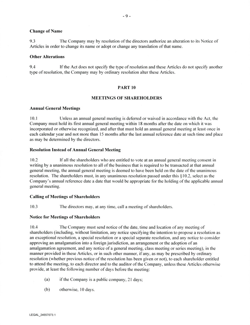 L EGAL _24557073 . 1 - 9 - Change of Name 3. T h e Co mp a n y m ay b y r eso luti o n of th e dir ec t o r s a uth o ri ze a n a lt erat i o n t o it s Not i ce of Articl es in o rder t o c h a n ge it s n a m e o r a d o pt o r c h a n ge a n y tran s l at i o n of th a t n a m e. Other Alterations 4. I f th e Ac t d oes n o t s p ec i fy th e ty p e o f r eso luti o n a nd th ese A rti c l es d o n o t s p ecify a n o th e r t y p e of r eso luti o n , th e Co mp a n y m ay b y o rdin ary r eso luti o n a lt e r th ese A rti c l es. PART 10 MEETING S OF SHAREHOLDER S Annual General Meeting s I 0.1 U nl ess a n a nnu a l ge n era l m ee tin g i s d efe rr e d o r wa i ve d in acco rd a n ce w i t h th e Act , t h e Co mp a n y mu s t h o ld i ts fir s t a nnu a l ge n e ral m ee tin g w ithin 18 m o nth s afte r th e d a t e o n w hi c h it was in co rp o rat e d o r o th e r w i se r ecog ni ze d , a nd afte r th a t mu s t h o ld a n a nnu a l ge n era l m eet in g a t l ea s t o n ce in eac h ca l e nd a r yea r a nd n o t m o r e th a n 15 m o nth s a ft e r th e la s t a nnu a l r efe r e n ce d a t e a t s u c h tim e a nd pl ace as m ay b e d ete rmin e d b y th e dir ec t o r s. Resolution Instead of Annual General Meetin g I 0 .2 I f a ll t h e s h a r e h o ld e r s w h o a r e e n t itl e d t o vo t e a t a n a nnu a l ge n era l m ee tin g co n se n t in w ritin g b y a un a nim o u s r eso luti o n t o a ll of t h e bu s in ess th a t i s r e quir e d to b e t ra n sac t e d a t th a t a nnu a l ge n era l m ee tin g , t h e a nnu a l ge n e r a l m ee tin g i s d ee m e d t o h ave b ee n h e ld o n th e d a t e of th e un a nim o u s r eso luti o n . T h e s h a r e h o ld er mu s t , in a n y un a nim o u s r eso lu t i o n p asse d und e r thi s † I 0 .2 , se l ec t as th e Co mp a n y 's a nnu a l r efe r e n ce d ate a d a t e th at wo uld b e a pp ro pri ate fo r t h e h o ldin g of th e a ppl ica bl e a nnu a l ge n e ral m eet in g. Calling of Meetings of Shareholder s 10 .3 T h e dir ec t o r s m ay , a t a n y t im e , ca ll a m ee tin g of s h a r e h o ld e r s . Notice for Meeting s of Shareholder s I 0.4 T h e Co mp a n y mu s t se nd n o ti ce of th e d ate , tim e a nd l oca ti o n o f a n y m ee tin g o f s h a r e h o ld e r s ( in c ludin g , w ith o ut limitati o n , a n y n o tic e s p ec i fy in g th e int e nti o n t o prop ose a r eso luti o n as a n exce pti o n a l r eso luti o n , a s p ec i a l r eso luti o n o r a s p ec i a l se p a rat e r eso luti o n , a nd a n y n o ti ce t o co n s id e r a pprovin g a n a m a l ga m a ti o n int o a fo r e i g n juri s di c ti o n , a n a rr a n ge m e nt o r th e a dopti o n of an amal ga mati o n ag r ee m e nt , a nd an y n o ti ce o f a ge n e ral m ee tin g , c l ass m ee tin g o r se ri es m ee tin g), in th e m a nn e r pro v id e d in th ese A rti c l es , o r in s u c h o th e r m a nn e r , i f a n y , as m ay b e pr esc rib e d b y o rdin a r y r eso luti o n (w h et h e r pr ev i o u s n o ti ce of th e r eso luti o n h as b ee n g i ve n o r n o t) , t o e a c h s h a r e h o ld e r e ntitl e d t o att e nd th e m ee tin g , to eac h dir ec t o r a nd t o th e a udit o r of th e Co mp a n y, unl ess th ese A r t i c l es o th e r w i se p rov id e, at l eas t th e fo ll ow in g numb e r of d ays b efo r e th e m ee tin g: (a) i f th e Co mp a n y i s a publi c co mp a n y , 2 1 da ys ; (b) ot h e r w i se , IO d ays.