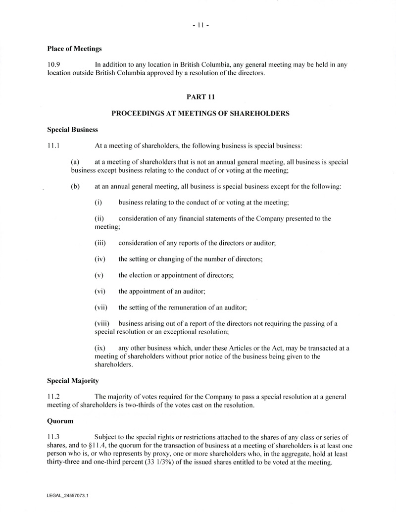 L EGAL _24557073 . 1 - 11 - Place of Meetings I 0 . 9 In additi o n t o an y l oca ti o n in Briti s h Co lumbi a , a n y ge n e ral m ee tin g m ay b e h e ld in a n y location out s ide Briti s h C olumbia approv e d b y a r es olution o f th e dir ec t o r s . PART 11 PROCEEDINGS AT MEETINGS OF SHAREHOLDERS Special Business I I . I A t a m ee tin g o f s h a r e h o ld e r s , th e fo ll ow in g bu s in ess i s s p ec i a l bu s in ess: (a) a t a m ee tin g o f s h a r e h o ld e r s th a t i s n o t a n a nnu a l ge n era l m eet in g , a ll bu s in ess i s s p ec i a l bu s in ess exce pt bu s in ess r e l a tin g t o th e co ndu c t o f o r vo tin g a t th e m ee tin g ; (b) a t a n a nnu a l ge n e r a l m ee tin g , a ll bu s in ess i s s p ec i a l bu s in ess exce pt fo r th e fo ll owi n g: (i) bu s in ess r e l a tin g t o th e co ndu c t o f o r vo tin g a t th e m ee tin g; (ii) co n s id era ti o n of a n y fin a n c ial s t a t e m e nt s o f th e Co mp a n y pr ese nt e d t o th e m ee tin g ; (iii) c o n s id era ti o n o f a n y r e p o 1 ts of th e dir e ct o r s o r a udit o r ; (iv) th e se ttin g o r ch a n g in g o f th e numb e r o f dir ec t o r s; (v) th e e l ect i o n o r a pp o intm e nt o f dir ec t o r s; (vi) th e a pp o intm e nt o f a n a udit o r ; (vii) th e se ttin g of th e r e mun e r a ti o n of a n a udit o r ; (viii) bu s in ess a ri s in g o ut o f a r e p o rt o f th e dir ec t o r s n o t r e qui r in g th e p ass in g of a s p ec i a l r eso luti o n o r a n exce p t i o n a l r eso luti o n ; (ix) a n y o th e r bu s in ess w hi c h , und e r th ese A rti c l es o r t h e Act , m ay b e tran sac t e d a t a m ee tin g of s h a r e h o ld e r s w i t h o ut pri o r n ot ic e of th e bu s in ess b e in g g i ve n t o th e s h a r e h o ld e r s. Special Majority 2. Th e m a j o ri ty o f vo t es r e quir e d for th e Co mp a n y t o pa ss a s p ec i a l r eso lu t i o n a t a ge n e r a l m ee tin g o f s h a r e h o ld e r s i s two - t hird s o f th e vo t es cas t o n th e r eso luti o n . Quorum 3. S ubj ec t t o th e s p ec ial ri g ht s o r r est ri c ti o n s att a ch e d t o th e s h a r es of a n y c l ass o r se ri es of s h a re s, and t o † I I .4 , th e qu o rum fo r th e tran sac ti o n of bu s in ess at a m ee tin g of s h a r e h o ld e r s i s a t l eas t o n e p e r so n w h o i s , o r w h o r e pr ese nt s b y pro xy , o n e o r m o r e s h a r e h o ld e r s w h o , in the agg r egate , h o ld a t l eas t thi1ty - thre e a nd o n e - third p e r ce nt (33 1 / 3%) o f th e i ss u e d s h a r es e ntitl e d t o b e v ot e d at th e m ee tin g.