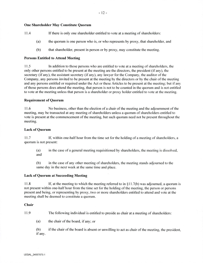 L EGAL _24557073 . 1 - 1 2 - One Shareholder May Con s titute Quorum 11 .4 If th e r e is o nl y o n e s h are h o ld e r e ntitl e d t o vo t e a t a m ee tin g of s h a r e h o ld e r s : (a) t h e qu o rum i s o n e p e r so n w h o i s , o r w h o r e pr ese nt s b y p roxy , th a t s h are h o ld e r , a nd (b) th at s h a r e h o ld e r , pr ese n t in p erso n o r b y p roxy, m ay co n s titut e t h e m ee tin g. Person s Entitled to Attend Meeting 5. In a ddi t i o n t o t h ose p e r so n s w h o a r e e ntitl e d to vo t e at a m ee tin g of s h a r e h o ld e r s , th e o nl y o th e r p e r so n s e ntitl e d t o b e pr ese nt a t th e m eet in g a r e th e dir ec t o r s, th e pr es id e n t ( i f a n y) , t h e sec r e t ary ( if a n y), t h e assis t a nt sec r e t a r y (if a n y) , a n y l awye r for th e Co mp a n y , t h e a udit o r of t h e Co mp a n y , a n y p e r so n s in v it e d t o b e pr ese nt at th e m eet in g b y th e dir ec t o r s o r b y th e c h a ir of th e m ee tin g a nd a n y p erso n s e nti t l e d o r r e quir e d und e r th e Act o r t h ese A rti c l es t o b e pr ese n t at th e m eeti n g ; bu t i f a n y o f th ose p e r so n s d oes a tt e nd th e m ee tin g, t h at p e r so n i s n ot t o b e co un te d in th e qu o ru m a nd i s n o t e n t itl e d t o vote at t h e m eet in g unl ess t h a t p e r so n i s a s h are h o ld e r o r p roxy h o ld e r e n t itl e d t o vote at th e m eet in g . Requirement of Quorum 6. N o bu s in ess, o th e r th a n t h e e l ect i o n of a c h a ir of t h e m ee tin g a nd t h e a dj o urnm e n t of th e m eet in g, m ay b e tra n sacte d at a n y m eet in g of s h are h o ld e r s unl ess a qu o rum of s h are h o ld e r s e n t i t l e d t o v ot e i s pr ese nt a t th e co mm e n ce m e n t of th e m ee tin g , bu t s u c h qu o rum n ee d n ot b e pr ese n t t h ro u g h o u t t h e m ee tin g . Lack of Quorum 11. 7 I f, w i t hin o n e - h a l f h o ur fro m t h e t im e se t fo r th e h o ldin g of a m eet in g of s h a r e h o ld e r s, a qu or um i s n o t p rese nt : (a) in t h e case of a ge n era l m eet in g r e qui sit i o n e d b y s h a r e h o ld e r s , th e m eet in g i s di sso l ve d , a nd (b) in th e case of a n y o th e r m eet in g of s h a r e h o ld e r s , th e m eet in g s t a nd s a d jo urn ed to t h e sa m e d ay in t h e n ext wee k at th e sa m e tim e a nd pl ace. Lack of Quorum at Succeeding Me e ting 11 . 8 If , a t th e m eet in g to w hi c h t h e m ee tin g r efe rr e d to in † I I . 7( b ) was a dj o urn e d , a qu o rum i s n o t p rese n t w ithin o n e - h a l f h o ur fr o m th e tim e se t fo r t h e h o ldin g of t h e m ee tin g , t h e p e r so n or p e r so n s pr ese nt a nd b e in g , o r r e pr ese ntin g b y p roxy , two or m o r e s h a r e h o ld e r s e ntitl e d to a tt e nd a nd vo t e at th e m eet in g s h a ll b e d ee m e d t o co n st i t u te a q u o rum . Chair 11. 9 T h e fo ll ow in g indi v idu a l i s e ntitl e d to pr es id e as c hair a t a m eet in g of s h a r e h o ld e r s: (a) th e c h a i r of t h e b oa rd , i f a n y; o r (b) if th e c h a ir of th e b oa rd i s a b se nt o r un w illin g t o ac t as c h a ir of th e m ee tin g , th e pr es id e nt , i f a n y .
