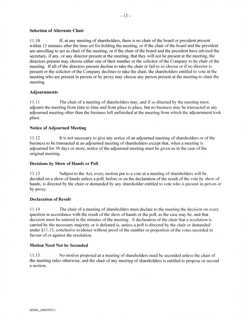L EGAL _24557073 . 1 - 1 3 - Selection of Alternate Chair 11 . 10 If , a t a n y m ee ting o f s har e h o ld e r s, th e r e i s n o c hair of th e b oa rd o r pr es id e nt pr ese nt w ithin 15 minut es a ft e r th e tim e sP - t for h o ldin g th e m ee tin g , o r i f th e c h a ir of th e b oa rd a nd th e pr es id e nt ar e un w illin g t o ac t as c hair of th e m ee tin g, o r i f th e ch a ir of th e b oa rd a nd th e pr es id e n t h ave a d v i se d th e sec r e tary , i f a n y , o r a n y dir e ct o r pr ese nt a t th e m ee tin g , t h a t t h ey w ill n o t b e pr ese nt at th e m ee tin g , th e dire c t o r s pr es ent m ay c h oose eith e r o n e of th e ir numb e r o r th e so li c it o r of th e Co mp a n y t o b e c h a ir of th e me e tin g. If a ll o f th e dir ec t o r s pr ese nt d e clin e t o t a k e th e c h a ir o r fa il to so c h oose o r if n o di rec t o r i s pr ese nt o r th e so li c it o r of th e Co mpan y d ec lin es t o tak e th e c h a ir , th e s h a r e h o ld e r s e ntitl e d t o vo t e a t th e meetin g w h o ar e pr ese n t in p e r so n o r b y pro xy m ay c h oose an y per so n pr ese nt a t th e m ee tin g t o c h a ir th e m ee tin g. Adjournments 1 1 . 11 Th e c h a ir o f a m eet in g of s h a r e h o ld ers m ay , a nd i f so dir ecte d b y t h e m ee tin g mu st , a dj o urn th e m eet in g fr o m tim e t o tim e a nd fro m pl ace t o pla ce , but n o bu s in ess m ay b e t ra n sacte d a t a n y a dj o urn e d m ee tin g o th e r than th e bu s in ess l e ft un fi ni s h e d a t th e m ee tin g fr o m w hi c h th e a dj o urnm e nt t ook pl ace. Notice of Adjourned Meeting 12. It i s n o t n ecess ar y t o g i ve a n y n o ti ce of a n a dj o urn e d m ee tin g of s h are h o ld ers o r of th e bu s in ess t o b e tr a n sac t e d a t a n a dj o urn e d m ee tin g o f s h a r e h o ld e r s exce pt th a t , w h e n a meet in g i s a dj o urn e d fo r 30 d ays o r m ore , n o ti ce o f th e a dj o urn e d m ee tin g mu s t b e g i ve n as in th e case of th e o ri g in a l m ee tin g. Decision s b y Show of Hand s or Poll 13. S ubj ec t to th e Ac t , eve r y m o ti o n put t o a vo t e a t a m eet in g of s h are h o ld e r s w iII b e d ec id e d o n a s h ow of h a nd s unl ess a p o ll , b efo r e o r o n th e d ec l a rati o n of th e r es ult of t h e vo t e b y s h ow of h a nd s , i s dir ec t e d b y t h e c h a ir o r d e m a nd e d b y a n y s h a r e h o ld e r e ntitl e d t o vo t e w h o i s pr ese nt in p e r s o n o r b y p roxy . Declaration of Re s ult 1 1 . 1 4 T h e c h a ir of a m eet in g of s h a r e h o ld e r s mu s t d ec l a r e t o th e m ee tin g t h e d ec i s i o n o n eve r y qu est i o n in acco rd a n ce w ith t h e r es uI t of th e s h ow o f h a nd s o r t h e p o ll , as t h e case m ay b e , a nd t h a t d ec i s i o n mu s t b e e nt e r e d in th e minut es of th e m ee tin g . A d ec l a rati o n of t h e c h a ir th a t a r eso luti o n i s c arri e d b y t h e n ecessa r y maj o ri ty o r i s d efea t e d i s , unl ess a p o ll i s dir ec t e d b y th e c h a ir o r d e m a nd e d und e r † 11 . 1 3 , co n c lu s i ve ev id e n ce w ith o ut p roof of th e numb e r o r p ro p o 1 i i o n of t h e vo t es r eco rd e d in favo ur of o r aga in st th e r eso luti o n . Motion Need Not be Second e d 11.1 5 No m ot i o n p ro p ose d a t a m ee tin g of s h a r e h o ld e r s n ee d b e seco nd e d unl ess th e c h a ir of th e m e etin g rul es o th e r w i se , a nd th e c h a ir of an y m ee tin g o f s h a r e h o ld e r s i s e ntitl e d t o p ro p ose o r seco nd a m o ti o n.