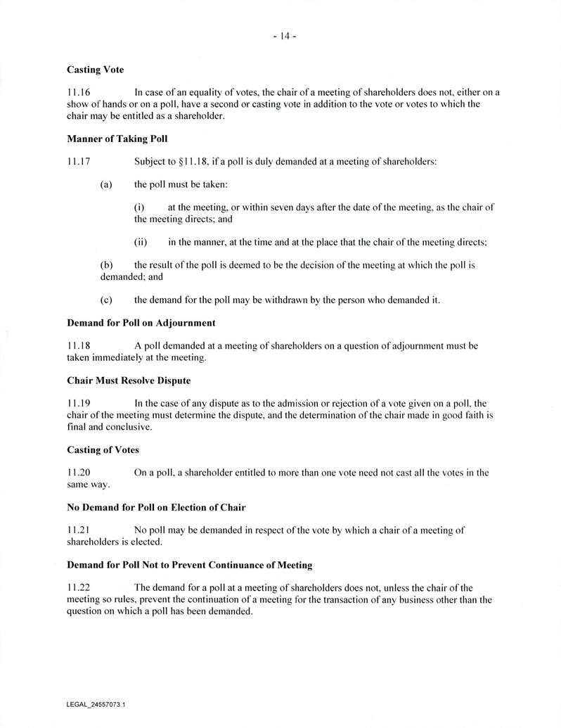 L EGAL _24557073 . 1 - 1 4 - Casting Vote I I. 16 In case of a n e qu a li ty of vo t es , th e c hair of a m ee tin g of s h a r e h o ld e r s d oes n o t , ei th e r o n a s h ow o f h a nd s o r o n a p o ll , ha ve a seco nd o r c a s tin g vo t e in a ddi t i o n t o t h e vo t e o r vo t es t o w hi c h th e ch a ir ma y b e e ntitl e d a s a s h a r e h o ld e r. Manner of Taking Poll I 1.1 7 S ubj ec t to † 11 . 18 , i f a p o ll i s dul y d e m a nd e d at a m ee tin g o f s h a r e h o ld e r s : (a) th e p o ll mu s t b e t a k e n: (i) a t th e m ee tin g, o r w ithin seve n d ays a ft e r t h e d a t e o f th e m eet in g , as th e c h a ir of th e m ee tin g dir ec t s; a nd (ii) in th e m a nn e r , a t th e tim e a nd a t th e pl ace that th e ch a ir o f th e m ee tin g dir ec t s; (b) t h e r es ult of th e p o ll i s d ee m e d to b e th e d ec i s i o n of th e m ee tin g a t w hi c h t h e p o ll i s d e m a nd e d ; a nd (c) th e d e m a nd for th e p o ll m ay b e w ithd raw n b y th e p e r so n wh o d e m a nd e d i t. Demand for Poll on Adjournment 11 . 18 A p o ll d e m a nd e d a t a m eet in g of s h a r e h o ld e r s o n a qu es ti o n of a dj o urnm e nt mu s t b e t a k e n imm e di a t e l y at th e m ee tin g. Chair Must Resolve Dispute 11 . 1 9 In th e case of a n y di s put e as t o th e a dmi ss i o n or r ejec ti o n o f a vo t e g i ve n o n a p o ll , t h e c h a ir o f th e m ee tin g mu s t d e t er min e th e di s pu te , a nd th e d ete rmin at i o n of th e c h a ir m a d e in goo d fa ith i s fin a l a nd co n c lu s i ve. Casting of Votes 11 .2 0 sa m e way . O n a p o ll , a s h a r e h o ld e r e nti t l e d t o m o r e th a n o n e vo t e n ee d n o t cas t a ll t h e vo t es in th e No Demand for Poll on Election of Chair I 1. 2 1 N o p o ll m ay b e d e m a nd e d in r es p ec t of th e vo t e b y w hi c h a c h a ir o f a m ee tin g o f s h a r e h o ld e r s i s e l ecte d . Demand for Poll Not to Prevent Continuance of Meeting 11. 22 T h e d e m a nd for a p o ll a t a m ee tin g o f s h a r e h o ld e r s d oes n o t , unl ess th e c h a i r o f th e m ee tin g so rul es , pr eve nt th e co n t inuati o n of a m ee tin g fo r th e t ra n sa cti o n o f a n y bu s in ess o th e r th a n th e qu es ti o n o n w h ic h a p o ll h as b ee n d e m a nd e d .
