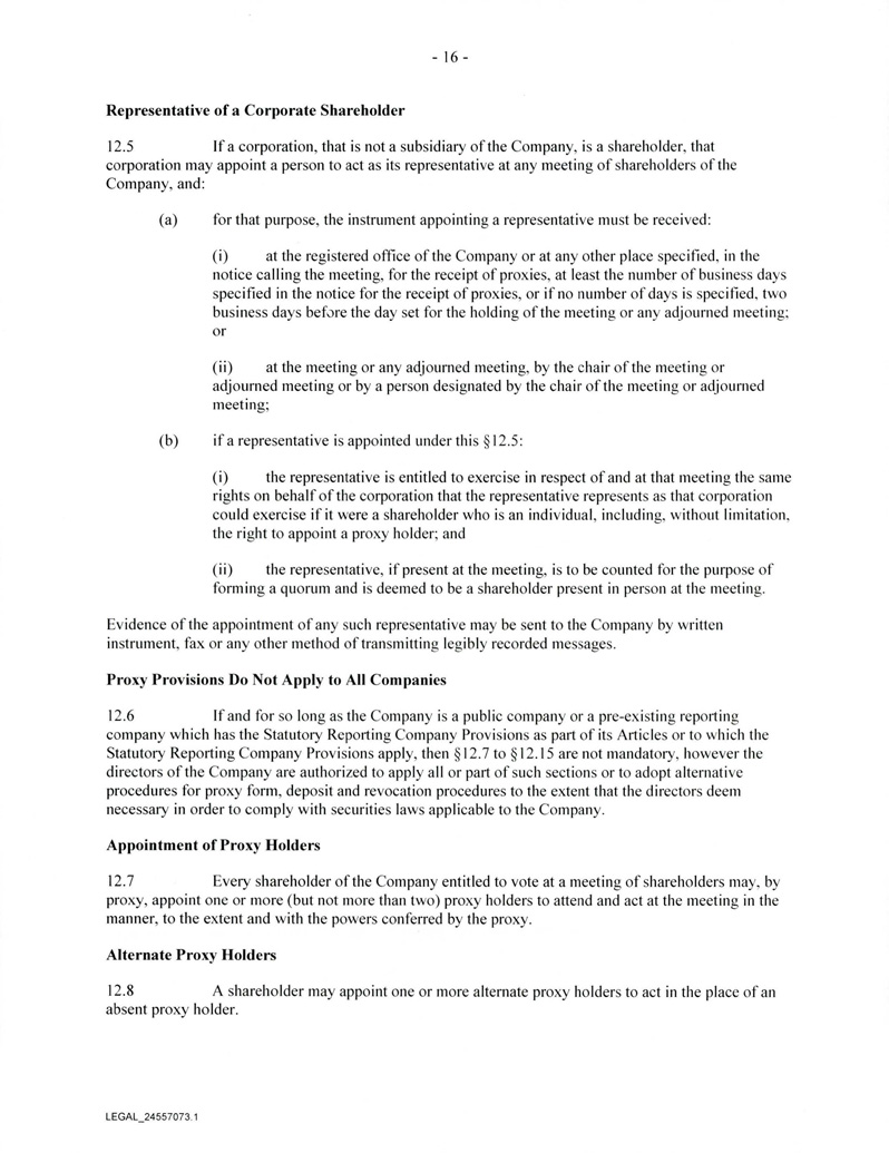 L EGAL _24557073 . 1 - 16 - Representative of a Corporate Shareholder 12.5 If a corporation, that is not a subsidiary of the Co mp a n y , is a shareholder, that corporation may appoint a person to act as its representative at any meeting of s h a r e h o l de r s of the Company, and: (a) for that purp ose , the instrument appointing a representative must be received: (i) at the registered office of the Company or at any other place specified, in the notice ca llin g the m ee tin g , for the receipt of p rox i es , at l eas t the number of bu s in e s s days specified in the notice for the receipt of p rox i es , or if no number of days is s p ec ifi e d , two business days before the day set for the holding of the m ee tin g or any adjourned m eet in g ; or (ii) at the meeting or any adjourned m ee ti ng , by the chair of the meeting or adjourned meeting or by a person designated by the chair of the meeting or adjourned meeting; (b) if a representative is appointed under this † 1 2 . 5 : (i) the representative is entitled to exercise in respect of and at that meeting the same rights on behalf of the corporation that the representative represents as that corporation could exercise if it were a shareholder who is an indi v idu a l , in c ludin g , without limi ta ti o n , the right to appoint a proxy h o ld e r ; and (ii) the r e pr ese n tat i ve , if present at t h e m eet in g , i s to be counted for the purpose of forming a quorum and i s deemed to be a shareholder present in p e r s o n at the m eet in g . Evidence of the appointment of any such representative may be ent to the Company by written in s trum e nt , fax or any other method of transmitting l eg ibl y recorded m es s ages. Proxy Provisions Do Not Apply to All Companies 1 2 . 6 If and for so l o n g as the Company is a public company or a pre - existing r e p o rtin g company which has the S t a tut o r y Repo1ting Company P rov i s i o n s as part of its A rti c l es or to which the Statutory Reporting Company Provisions a ppl y , then † 12. 7 to † 12.15 are not m a nd ato r y , however the directors of the Company are authorized to apply all or patt of such sections or to adopt alternative procedures for proxy fo rm , deposit and revocation procedures to the extent that the directors deem necessary in order to comply with securities laws applicable to the Company. Appointment of Proxy Holders 12 . 7 Every s h a r e h o ld e r of the Company entitled to vote at a meeting of s h a r e h o ld e r s m ay , by p roxy , appoint one or more (but not more than two) proxy h o ld e r s to attend and act at the meeting in the manner, to the extent and with the powers conferred by the proxy . Alternate Proxy Holders 12 . 8 A shareholder may appoint one or more alternate proxy h o ld e r s to act in the place of an absent proxy holder .