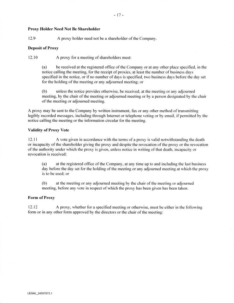 L EGAL _24557073 . 1 - 1 7 - Proxy Holder Need Not Be Shareholder 9. A prox y h o ld e r n e ed n o t b e a s har e h o ld e r o f th e Co mp a n y. Deposit of Proxy 10. A pro xy for a m ee tin g o f s h a r e hold e r s mu st: (a) b e r ece i ve d at th e re g i s t e red o ffic e o f th e Co mp a n y o r a t a n y o th e r pl ace s p ec ifi e d , in th e noti ce c allin g th e m e etin g, for t h e r ece ipt of pro x i es, a t l eas t th e numb e r o f bu s in ess d ays s p e cified in the n o tic e, o r if n o numb e r o f d ays i s s p e c i fi e d , t wo bu s in ess d ays b efo r e th e d ay se t for th e h o ldin g o f the m ee tin g o r an y a dj o urn e d m ee tin g; o r (b) unl ess th e n o ti ce pro v id es o th e r w i se, b e r ece i ve d , a t th e m ee tin g o r a n y a dj o urn e d m ee tin g, b y th e ch a ir o f the m ee tin g o r a dj o urn e d m ee tin g o r b y a p e r so n d es i g n a t e d b y th e c h a ir o f th e m ee tin g o r a djourn e d m ee tin g. A pro xy m ay b e se nt to th e Compan y b y w rit te n in s trument , fa x o r a n y o th e r m e thod o f tran s mitti ng l eg ibl y r e c o rd e d m essages, in c ludin g th ro u g h Int e rn e t o r t e l e ph o n e vo tin g o r b y e m a il , i f p e rmitt e d b y th e n o tic e ca llin g th e m ee tin g o r the in fo rm a ti o n c ir c ul a r fo r th e m ee tin g. Validity of Proxy Vote 11. A vo t e g i ve n in ac c o rd a n ce w i t h th e t e rm s of a p roxy i s va lid n otwi th s t a ndin g th e d ea th o r in c apa c i ty o f th e s h a r e h o ld e r g i v in g th e p roxy a nd d es pit e th e r evoca ti o n of th e p roxy o r t h e r evoca ti o n o f th e a uth o ri ty und e r w hi c h th e p roxy i s g i ve n , unl ess n o ti ce in w ritin g of th a t d ea th , in ca p ac i ty o r r evoca ti o n i s r ece i ve d: (a) a t th e r eg i s t e r e d o ffi ce of th e Co mp a n y , a t a n y t im e up t o a nd in c ludin g th e l as t bu s in ess d ay b efo r e th e d ay se t fo r th e h o ldin g o f th e m eet in g o r a n y a dj o urn e d m ee t i n g a t w hi c h th e p roxy i s t o b e u se d ; o r (b) a t t h e m ee tin g o r a n y a dj o urn e d m eet in g b y th e c h a ir o f th e m eet in g o r a dj o urn e d m ee tin g, b efo r e a n y vo t e in r es p ec t of w hi c h th e p roxy h as b ee n g i ve n h as b ee n t a k e n . Form of Pro xy 12. A p roxy , w h e th e r fo r a s p ec ifi e d m ee tin g or o th e r w i se, mu s t b e e ith e r in th e fo ll ow in g fo rm o r in an y oth e r form a pp rove d b y th e dir e ct o r s o r th e c h a ir o f th e m ee tin g :