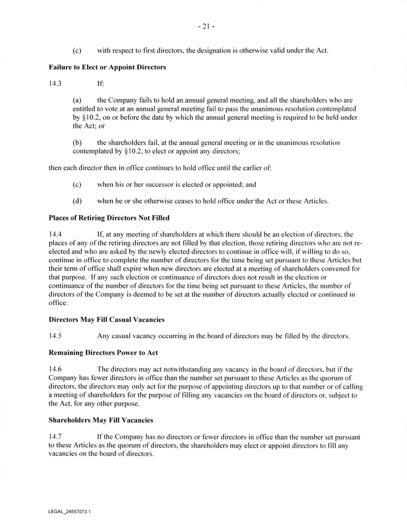 L EGAL _24557073 . 1 - 21 - (c) with respect to first directors, the designation is otherwise valid under the Act. Failure to Elect or Appoint Directors 14.3 If: (a) the Company fails to hold an annual general m eet in g , and all the shareholders who are entitled to vote at an annual general meeting fail to pass the unanimous resolution contemplated by † 10.2, on or before the date by which the annual general meeting is required to be held under the Act ; or (b) the shareholders fail, at the annual general meeting or in the unanimous resolution contemplated by † 10 .2 , to elect or appoint any dir ec t o r s ; then each director then in office continues to hold office until the earlier of: (c) when his or her successor is elected or a pp o int e d ; and (ct) when he or she otherwise ceases to hold office under the Act or these Atticles. Places of Retiring Directors Not Filled 4. If , at any meeting of shareholders at which there should be an election of dir ectors , the places of any of the retiring directors are not filled by that e l ec ti o n , those retiring directors who are not re elected and who are asked by the newly elected directors to continue in office will, if willing to do so, continue in office to complete the number of directors for the time being set pursuant to these Articles but their term of office shall expire when new directors are elected at a meeting of shareholders convened for that purp ose . If any such election or continuance of directors does not result in the election or continuance of the number of directors for the time being set pursuant to these Art i c l es , the number of directors of the Company is deemed to be set at the number of directors actually elected or continued in office. Directors May Fill Casual Vacancies 5. Any casual vacancy occurring in the board of directors may be filled by the directors. Remaining Directors Power to Act 6. The directors may act notwithstanding any vacancy in the board of directors , but if the Company has fewer directors in office than the number set pursuant to these Atticles as the quorum of dir ec t ors , the directors may only act for the purpose of appointing directors up to that number or of calling a meeting of shareholders for the purpose of filling any vacancies on the board of directors or, subject to the Act , for any other purpose. Shareholders May Fill Vacancies 7. If the Company has no directors or fewer directors in office than the number set pursuant to these Atticles as the quorum of dir ecto r s , the shareholders may elect or appoint directors to fil I any vacancies on the board of directors.