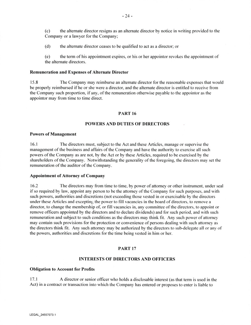 - 24 - (c) the alternate director resigns as an alternate director by notice in writing provided to the Company or a lawyer for the Company; (d) the alternate director ceases to be qualified to act as a director; or (e) the term of his appointment e x pir es , or his or her appointor revokes the appointment of the alternate directors. Remuneration and Expenses of Alternate Director 15.8 The Company may reimburse an alternate director for the reasonable expenses that would be properly reimbursed if he or she were a dir ec tor , and the alternate director is entitled to receive from the Company such proportion, if any, of the remuneration otherwise payable to the appointor as the appointor may from time to time direct. PART16 POWERS AND DUTIES OF DIRECTORS Powers of Management 1. The directors mu s t , subject to the Act and these Articles, manage or supervise the management of the business and affairs of the Company and have the authority to exercise all such powers of the Company as are n o t , by the Act or by these Articles, required to be exercised by the shareholders of the Company. Notwithstanding the generality of the foregoing, the directors may set the remuneration of the auditor of the Company. Appointment of Attorney of Company 2. The directors may from time to tim e , by power of attorney or other in s trum e nt , under seal if so required by l aw , appoint any person to be the attorney of the Company for such purp oses , and with such pow e r s , authorities and discretions (not exceeding those vested in or exercisable by the directors under these Articles and exceptint the power to fill vacancies in the board of dir ec t o r s , to remove a dir ec t o r , to change the membership of, or fill vacancies in , any committee of the dir ec t o r s , to appoint or remove officers appointed by the directors and to declare dividends) and for such p e ri o d , and with such remuneration and subject to such conditions as the directors may think fit. Any such power of attorney may contain such provisions for the protection or convenience of persons dealing with such attorney as the directors think fit. Any such attorney may be authorized by the directors to sub - delegate all or any of the p owe r s , authorities and discretions for the time being vested in him or her. PART 17 INTERESTS OF DIRECTORS AND OFFICERS Obligation to Account for Profits 1. A director or senior officer who holds a disclosable interest (as that term is used in the Act) in a contract or transaction into which the Company has entered or proposes to enter is liable to LEGAL_245570731