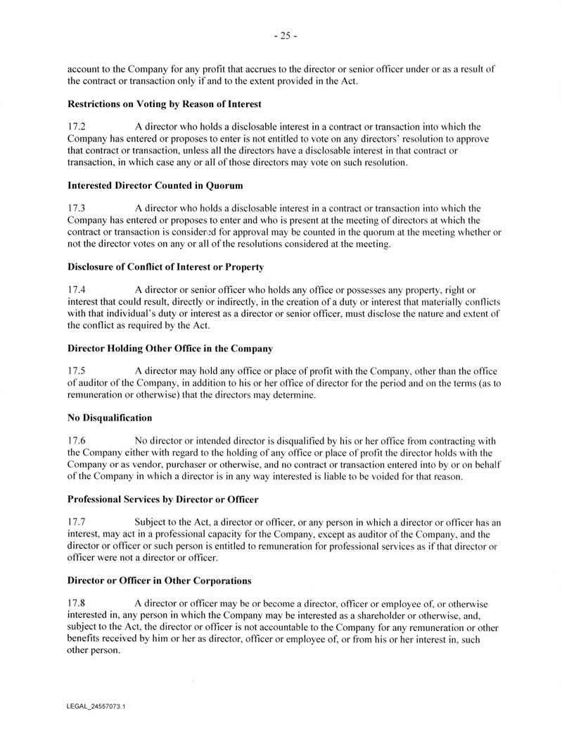 LE GAL_24557073 . 1 - 25 - account to the Co mpan y for a n y profit that acc rue s to the director o r se ni or office r und e r or as a result of the contract or transaction only if and to th e extent provided in the Act. Restrictions on Voting by Reason oflnterest 2. A director who h o ld s a di sc lo sa bl e int e r es t in a contract or transaction int o which the Co mpan y ha s e nt e r ed or proposes to e nter i s n ot e ntitl ed to vote o n any dir ectors ' r eso luti o n to approve that contract or transaction , unl ess all the directors h ave a di sc l osab l e interest in that contract o r transaction, in w hi c h case a n y o r a ll of those directors may vote o n s u c h r eso luti o n . Interested Director Counted in Quorum 3. A dir ector w h o h o ld s a di sc l osab l e int e r est in a co ntra ct o r transaction int o w hi c h the Co mp a n y ha s e nt e r e d o r proposes to e nter and who i s pr ese nt at the m eet in g of directors at w hi c h the co ntra c t or transaction i s co n s id e r , ! d for approval may be co unt e d in the qu o rum at the meeting w h et h e r o r n ot th e dir ec t or votes o n a n y or all of th e resolutions co n s id e r ed at th e m eet in g . Disclosure of Conflict of Interest or Property 4. A director or senio r officer w h o h o ld s a n y office or p osses es a n y prope1ty, right o r int e r es t th a t could r es ult , directly o r indir ect l y , in the c r eat i o n of a du ty or interest that m ate ri a ll y co nfli c t s with t h at indi vid ual ' s du ty o r int e r est as a director or se ni or office r , mu st disclose the nature a nd exte nt of the co nfli ct as required by the Act. Director Holding Other Office in the Company 5. A director may h o ld any office o r pl ace of profit w ith the Co mp any , ot h er than th e office of auditor of the Company , in addit i o n to his or her office of director for the period a nd on the term s (a s to remuneration or ot h erwi e) that the director may determine. No Disqualification I 7 . 6 No director or intended director i s disqualified by hi s or her office from co ntra cti n g w ith the Com p a n y e ith e r w ith r ega rd to the h o ldin g of any office o r pl ace of p rofit the director h o ld s w ith th e Co mpan y o r as ve nd o r , purchaser or ot h erw i se , a nd n o contract o r tran sact i on e nt ered in to b y o r on behalf of the Compa n y in w hi c h a director is in a n y way int erested i s li ab l e to be voided for that r eason. Professional Services by Director or Officer I 7 . 7 S ubj ect to the Act , a director or officer , o r a n y person in w hi c h a director or office r ha an int erest , m ay act in a professional ca p ac i ty for the Compa n y , except as a udit o r of the Co mp a n y , a nd the dir ector or of fi ce r or s u c h p erso n i s e ntitl ed to remuneration for pro fessio n a l services as i f that director or officer were n ot a director o r office r. Director or Officer in Other Corporations I 7 . 8 A director or officer m ay be or become a director , office r or emp l oyee of , or ot h erw i se int ereste d in , a n y p e r o n in w hi c h th e Co mpan y m ay be int e r este d as a s har e h o ld e r o r ot h e r wise , and , s ubj ect to th e Act , the director or officer i s n ot acco unt ab l e to the Co mp a n y fo r a n y r e mun eratio n or ot h e r b e nefit s received by him o r h er as director , officer o r emp l oyee of , o r from hi s or her interest in , suc h other person .