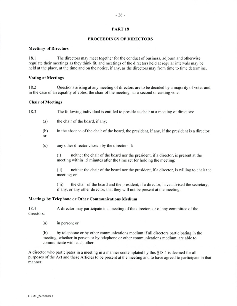 LE GAL_24557073 . 1 - 2 6 - PART 18 PROCEEDINGS OF DIRECTORS Meetings of Directors 1. Th e dir ec t o r s ma y me e t t oge th e r fo r th e co nduct o f bu s in ess , a dj o urn a nd o th e r w i se re g ul a te th e ir m ee tin gs as th ey think fit , a nd m ee tin g o f th e dir ec t o r s h e ld a t r eg ul a r int e r va l s m ay b e h e ld at th e pla ce , a t th e tim e a nd o n th e n o ti ce , i f a n y , a th e dir ec t o r s m ay fro m tim e to tim e d e t e rmin e. Voting at Meeting s 2. Qu es ti o n s a ri s in g at an y m ee tin g of dir ec t o r s a r e to be d ec id e d b y a m a j o rit y o f vo t es a nd, in th e ca se of an e quali ty o f vo t es, the c hair o f th e m ee tin g h as a sec ond o r cas tin g vo t e. Chair of Meetings 3. T h e fo ll ow in g indi v idu a l i s e ntitl e d t o pr e s id e as c h a ir a t a m ee tin g of dir ec t o r : (a) th e c h a ir of t h e b oa rd , if a n y; (b) in th e a b se n ce of the ch a ir o f th e b oa rd , th e pr es id e nt , if a n y , i f th e pr e s id e nt i s a dir ec t o r ; o r (c) a n y o th e r dir ec tor ch os en b y th e dir ec t o r i f : (i) n e ith e r th e ch a ir of th e b oa rd n o r th e pr es id e nt , i f a dir ec t o r , i s pr e s e nt a t th e m ee tin g w ithin 1 5 minut e s a ft e r th e tim e e t fo r h o ldin g th e m ee tin g; (ii) n e ith e r th e c hair of th e b oa rd n o r th e pr es id e nt , i f a dir ecto r , i s w illin g t o c h a ir th e m ee tin g ; o r (iii) th e c h a ir o f th e b oa rd a nd t h e pr e s id e nt , i f a dir ec t o r , h av e a d v i e d th e s ec r e t a r y, if a n y , o r a n y o th e r dir ec t o r , th a t th ey w ill n o t b e pr ese nt a t th e m eet in g . Meetings by Telephone or Other Communication s Medium 4. A dir ec t o r m ay participat e in a m ee tin g of th e dir ec t o r s o r o f an y co mmitt ee o f th e dir ec t o r s: (a) in p e r so n ; o r (b) b y t e l e ph o n e o r b y o ther c o mmuni ca ti o n s m e dium if all dir e ct o r parti c ip a tin g in th e m ee tin g , w h et h e r in p e r s o n o r b y t e l e ph o n e o r o th e r co mmuni ca ti o n s m e dium , a r e a bl e t o co mmuni ca t e w ith eac h oth e r. A dir ec t o r w h o p a rti c ip a t es in a m ee tin g in a m a nn e r co nt e mplat e d b y thi s † 18 .4 i s d ee m e d fo r a ll purpo ses o f th e A c t a nd th ese Arti c l es t o b e pr ese nt at th e m ee tin g and t o ha ve a g r ee d t o parti c ip a t e in th a t manner.