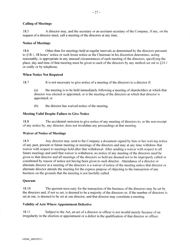 LE GAL_24557073 . 1 - 2 7 - Calling of Meetings l 8 . 5 A direct o r ma y, and the se cret ary o r a n ass i s tant sec r e t a r y of th e Co mp a n y , if a n y , o n th e r e que s t o f a dir e ct o r mu s t , call a m ee tin g of th e dir ec t o r s at a n y tim e. Notice of Meetings 6. O th e r th a n for m ee tin gs h e ld at r eg ul a r int e r va l s as d e t e rmin e d b y th e dir ec t o r s pur s u a n t t o † 18.1 , 48 h o ur s ' n o ti ce o r s u c h l esse r n o tic e as th e C h a irm a n in hi s di sc r e ti o n d e t e rmin es , act in g r eas onabl y, i s a ppropriat e in a n y unu s u a l c ircum s t a n ces of eac h m ee tin g of t h e dir ec t o r s , s p ec if y in g th e pl ace , d ay and tim e o f th a t m ee tin g mu s t b e g i ve n t o e a c h of th e dir ec t o r s b y a n y m e th od se t o ut in † 24. 1 o r o rall y o r b y t e l e phon e . When Notice Not Required 7. It i s not ne cessa r y t o g i ve no t i ce o f a m ee tin g of th e dir e c to r s t o a dir ec t o r i f: (a) th e m ee tin g i s t o b e h e ld imm e di ate l y fo ll ow in g a m ee tin g of s h a r e h o ld e r s at w hi c h th at dir ec t o r was e l ec t e d o r a pp o int e d , o r i s th e m ee tin g of th e dir ec t o r s a t w hi c h th a t dir ec t o r i s a pp o int e d ; o r (b) t h e dir ec t o r h as w a i ve d n o tic e o f th e m ee tin g. Meeting Valid Despite Failur e to Give Notice 8. Th e acc id e nt a l o mi ss i o n to g i ve n o ti ce of a n y m ee tin g o f dir ec t o r s t o , o r th e n o n - r ece ipt of a n y n ot i ce b y , a n y dir ec t or , d oes n o t in va lid a t e a n y p rocee din g s a t th a t m eet in g . Waiver of Notic e of Meetings 9. A n y dir ecto r m ay s e nd t o t h e Co mp a n y a d oc um e nt s i g n e d b y him o r h e r wa i v in g n o ti c e of a n y p as t , pr ese n t o r futur e m ee tin g o r m ee tin gs of t h e dir ec t o r s a nd ma y a t a n y t im e w ithdr aw th a t wa i ve r w ith r e s p ec t t o m ee tin g s h e ld a ft er th at w ithd rawa l. Af t e r se ndin g a wa i ve r w ith r e s pec t to a ll fu t ur e m ee tin gs a nd until th a t w a i ve r i s w ithd raw n , n o n o ti ce of a n y m ee tin g of th e dir ec t o r s n ee d b e g i ve n t o th a t dir ecto r a nd a ll m eet in g s of t h e dir ec t o r s so h e ld a r e d ee m e d n o t t o be imp ro p e rl y ca ll e d o r c o n s ti t u te d b y r easo n of n o ti ce n o t h av in g b ee n g i ve n t o s u c h dir ec t o r . Att e nd a n ce of a dir ec t or o r a lt e rn a t e dir ec t o r at a m ee tin g of th e dir ec t o r s i s a wa i ve r of n o ti ce of th e m eet in g unl e ss th at d ir ecto r o r alt e rn a t e dir ec t o r at te nd s th e m ee tin g fo r th e ex pr ess purp ose of o bj ec tin g t o th e tran sac ti o n of a n y bu s in ess o n th e gro und s t h a t t h e m ee tin g i s n o t l aw full y ca ll e d . Quorum 10. T h e qu o rum n ec,esa r y fo r th e t ra n sac tion o f th e bu s in ess of th e dir e ct o r s m ay b e se t b y th e dir ec t o r s a nd , i f n o t so se t , i s d ee m e d t o b e a maj o rit y of th e dire c t o r s o r , if th e numb e r o f dir ec t o r s i s se t at o n e , i s d ee m e d t o b e set a t o n e dir ecto r , a nd th a t dir ec t o r m ay co n s titut e a m ee tin g. Validity of Acts Wher e Appointment Defective 11. S ubj ec t t o th e Ac t , a n a c t o f a dir ec t o r o r offi c e r i s n o t in va lid m e r e l y b eca u s e of a n irr eg ularit y in th e e l ec ti o n o r a pp o i n tm e nt o r a d efect in th e qu a lifi ca ti o n o f th a t dir e ct o r o r of fi cer.