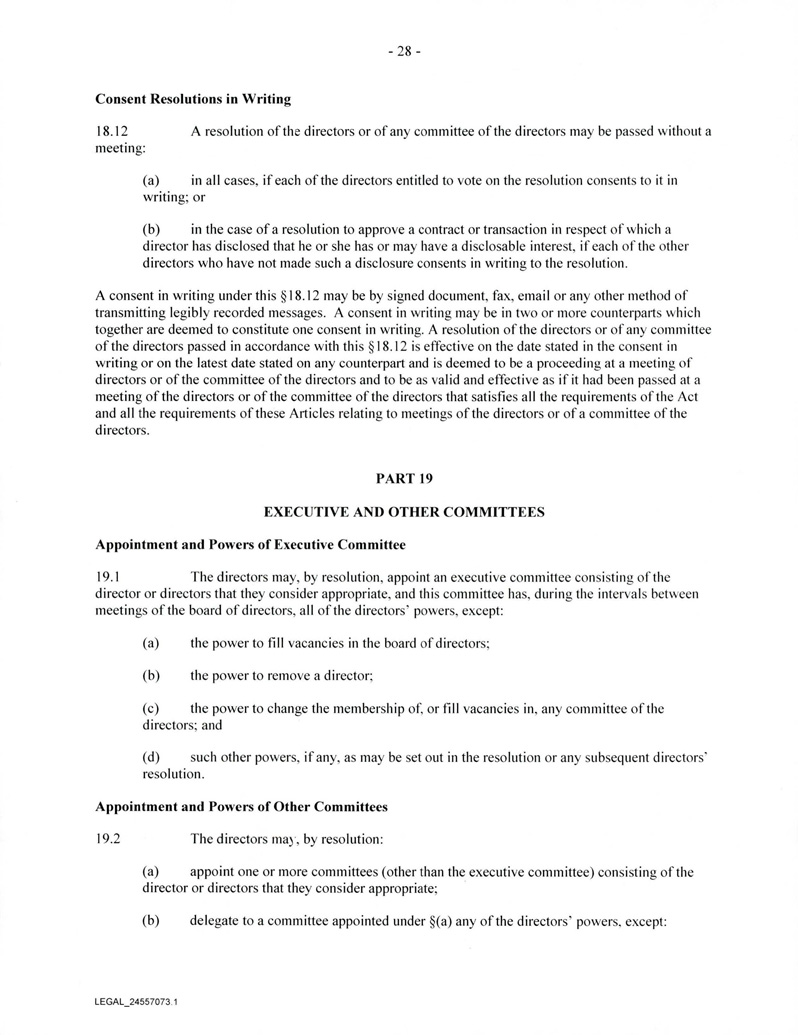 LE GAL_24557073 . 1 - 28 - Consent Resolutions in Writing 18.12 A r eso luti o n of th e direct o r s or of a n y co mmitt ee of the directors ma y b e passed w ith o ut a m ee tin g: (a) in a ll cases, if eac h of the directors e ntitl ed to vo t e o n th e r eso luti o n co n se nt s to it in writing; or (b) in the case of a re so lution to approve a contract o r transaction in r es p ec t of which a dir ecto r ha s di sclose d that h e o r s h e ha s o r m ay h ave a disclosable int e r est , if eac h of the o th e r director s who hav e not m a d e s uch a di sc l os ure co n se nt s in writing to the r eso luti o n . A consent in writing under thi s † 18 . 12 ma y be by s i g n e d document , fax, e mail or a n y ot h e r m et h od of transmitting l eg ibl y r ecor d e d m essages. A co n se nt in w ritin g m ay b e in two or mor e co unt er p a rt s w hi c h together are deemed to constitute one consent in writing. A r eso luti o n of the dir ecto r s o r of a n y co mmitt ee of the dir ecto r s pa sse d in accordance w ith this † 18 . 1 2 is effective o n th e d ate sta t ed in the co n se nt in writing o r on the lat es t dat e stated on any counterpart a nd i s d ee m e d to be a p rocee din g at a m eet in g of dir ec t o r s or of the co mmitt ee of the dir ecto r s a nd to b e as va lid and effect i ve as if it h ad been passed at a m ee tin g of the directors or of the committee of the dir ecto r s that sat i s fi es a ll the requirements of the Act and all the r eq uir eme nt s of th ese A t t i c l es r e latin g to m eet in gs of the dir ecto r s o r of a co mmitt ee of th e dir ec t o r s. PART 19 EXECUTIVE AND OTHER COMMITTEES Appointment and Powers of Executive Committee 1. The dir ecto r s may, by resolution , a pp o int a n exec uti ve co mmi ttee co n s i st in g of the dir ecto r or dir ectors that th ey co n s id e r appropriate , a nd this co mmitt ee h as, durin g the int erva l s between m eet in gs of the b oard of dir ecto r s , a ll of the dir ecto r s' power s , exce pt: (a) the p ower to fill vacancies in t h e board of directors ; (b) the power to remove a director; (c) the p owe r to c h a n ge th e membership of, or fill vacancies in , any committee of the dir ectors; a nd (d) s u c h ot h e r powers , if a n y , as ma y b e set o ut in th e resolution or a n y s ub seq u e nt directors ' r eso luti o n . Appointment and Power s of Other Committees 2. Th e dir ec t ors m ay, by resolution: (a) appoint one or more committees (ot h e r t han the executive committee) consisting of th e direct o r or dir ecto r s th at they consider appropriate; • (b) del egate to a co mmitt ee appointed und e r † (a) any of th e dir ectors' powers, except: