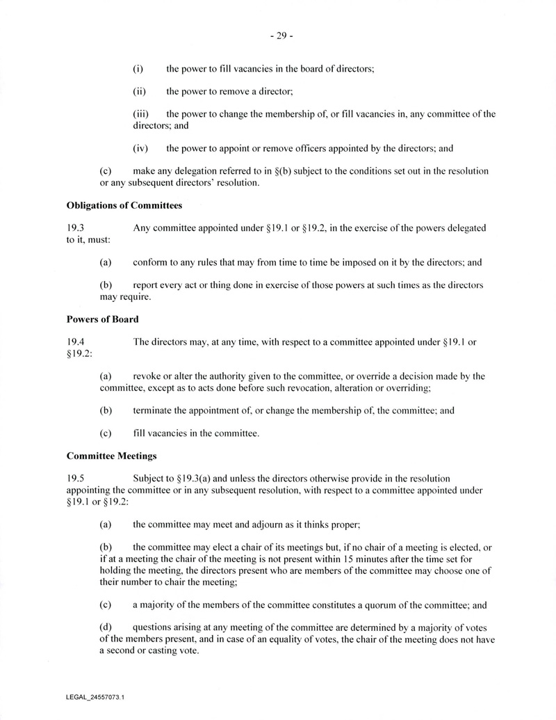 LE GAL_24557073 . 1 - 29 - (i) th e pow e r t o fill v aca n c i es in t h e b oa rd of dir ecto r s; ( ii ) th e p owe r to re m ove a dir ecto r ; (c ) (iii) th e p owe r t o c h a n ge t h e m e mb e r s hip o f , o r fill vaca n c i es in , a n y co mmitt ee of th e dir ec tor s; a nd (iv) th e p owe r t o a pp o int o r r e m ove of fi ce r s a pp o int e d b y th e dir ec t o r s ; a nd m a k e an y d e l egat i o n r efe rr e d t o in † ( b ) s ubj ec t t o th e co ndi t i o n s set o ut in th e r eso luti o n o r a n y s ub se qu e nt dir ecto r s' r eso luti o n . Obligations of Committees 3. A n y co mmitt ee a pp o in te d und e r † 1 9. 1 o r † 1 9.2 , in th e exe r c i se of t h e p owe r s d e l ega t e d t o it , mu s t: (a) co n fo rm t o a n y rul es t h at m ay fr o m tim e t o tim e b e imp ose d o n it b y th e dir ec t o r s; a nd (b) r e p o 1 t eve r y act o r thin g d o n e in exe r c i se o f t h ose p owe r s at s u c h tim es as t h e dir ec t o r s m ay r e quir e. Pow e r s of Board 4. Th e dir ec t o r s m ay, a t a n y tim e, w i t h r es p ec t to a co mmitt ee a pp o int e d und e r † 1 9. 1 o r † 19 .2: (a) r evo k e o r a l te r t h e a uth o ri ty g i ve n t o th e co mmitt ee , o r ove rrid e a d ec i s i o n m a d e b y th e co mmitt ee , exce pt as to acts d o n e b efo r e s u c h r evoca ti o n , a lt era ti o n o r ove rridin g; (b) t e rmin a t e t h e a pp o in t m e n t of , o r c h a n ge th e m e mb e r s hip o f , th e co mmi ttee; a n d (c) fill vaca n c i es in t h e co mmi ttee . Committee Meeting s 5. S ubj ec t t o † 1 9.3(a) a nd unl ess th e dir ec t o r s o th e r w i se p rov id e in th e r eso lu t i o n a pp o intin g th e co mmitt ee o r in a n y s ub se qu e nt r eso lu t i o n , w ith r es p ect to a co mmitt ee a pp o int e d und er † 19 . 1 o r † 1 9.2: (a) th e co mmi ttee m ay m ee t a nd a dj o urn as i t t hink s p ro p e r ; (b) t h e co mmitt ee m ay e l ec t a c h a ir o f it s m ee tin gs but , i f n o c hair of a m eet in g i s e l ec t e d , o r if a t a m eet in g th e c h a ir of th e m ee tin g i s n o t pr ese nt within 1 5 minut es afte r th e tim e se t fo r h o ldin g th e m ee tin g , th e dir ec t o r s pr ese nt w h o ar e m e mb e r s o f th e co mmitt ee m ay c h oose o n e of th e ir numb e r t o c h a ir th e m ee tin g; (c) a m a j o ri ty o f th e m e mb e r s of th e co mmitt ee co n s titut es a qu o rum o f th e co mmitt ee ; a nd (d) qu es ti o n s a ri s in g a t a n y m ee tin g of th e co mmitt ee a r e d e t e rmin e d b y a m a j o ri ty of vo t es of th e m e mb e r s pr ese n t , a nd in case of a n e qu a lit y of votes , th e c h a i r of t h e m ee tin g d oes n ot h ave a seco nd o r cas tin g vo t e .