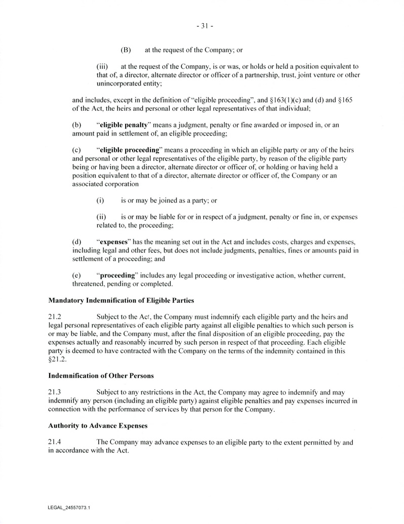 LE GA L _24557073 . 1 - 3 I - ( B ) a t th e r e qu est o f th e Co mp a n y ; o r ( iii ) a t th e r e qu es t o f th e Co mp a n y , i s o r w as , o r h o ld s o r h e ld a p os iti o n e qui va l e nt t o th a t o f , a dir ec t o r , a lt e rn a t e dir ec t o r o r o ffi ce r o f a p a rtn e r s hip , tru s t , j o int ve ntur e o r o th e r unin co rp o rat e d e ntit y ; and includ es , exce pt in th e d e finiti o n o f " e li g ibl e pro cee din g ", a nd † 16 3( I )(c) a nd ( d ) a nd † 16 5 of th e A c t , th e h e ir s a nd p e r so nal o r o th e r l ega l r e pr ese nt a ti ves o f th a t indi v idu a l ; (b) " eligible penalty " m ea n s a jud g m e nt , p e n a l ty o r fin e awa rd e d o r imp ose d in , o r a n a mount paid in se ttl e m e nt o f , a n e li g ibl e pr ocee din g; (c) " eligible proceeding " m e an s a p rocee din g in w hi c h an e li g ibl e p a r ty o r a n y of th e h e ir s a nd p e r so nal o r o th e r l ega l r e pr ese nt a ti ves o f th e e li g ibl e p a r ty , b y r easo n o f th e e li g ibl e p a r ty b e in g o r h av in g b ee n a dir ec t or , a lt e rn a t e dir ec t o r o r of fi ce r of , o r h o ldin g o r h av in g h e ld a p os iti o n e qui va l e nt t o th a t of a dir ecto r , a lt e rn a t e dir ecto r o r o ffi ce r of , th e Co mp a n y o r a n assoc iat e d co rp ora ti o n (i) i s o r ma y b e j o in e d a s a p arty ; o r (ii) i s o r ma y b e li a bl e fo r o r in r es p ec t o f a jud g m e nt , p e n a lt y o r fin e in , o r ex p e n se s r e l a t e d t o , th e p rocee din g ; (d) " e x pen s e s " h as th e m ea nin g se t o ut in th e Ac t a nd in c lud es costs , c h a r g es a nd ex p e n s es , in c ludin g l ega l a nd o th e r fees , but d oes n o t in c lud e jud g m e nt s , p e n a lti es , fin es o r a m o unt s p a id in se ttl e m e n t of a pr ocee din g; a nd (e) " proceeding " in c lud es a n y l ega l p rocee din g o r in ves ti ga ti ve act i o n , w h e th e r c urr e nt , t hr ea t e n e d , p e ndin g o r co mpl ete d . Mandatory Indemnification of Eligible Parties 2. S ubj ec t t o th e Ac t, th e Co mp a n y mu s t ind e mni fy eac h e li g ibl e p arty a nd t h e h e ir s a nd l ega l p e r so n a l r e pr ese nt a ti ves of eac h e li g ibl e p a rt y aga in st a ll e li g ibl e p e n a lti es to w hi c h s u c h p erso n is o r m ay b e li a bl e , a nd t h e Co mp a n y mu s t , a ft e r th e fin a l di s p os i t i o n of a n e li g ibl e p rocee din g , p ay th e ex p e n ses a ctu a ll y a nd r easo n a bl y incurr e d b y s u c h p e r so n in r es p ec t of th a t p rocee din g. Eac h e li g ibl e party i s d ee m e d t o h ave co nt rac t e d w ith th e Co mp a n y o n t h e te rm s o f th e ind e mnit y co nt a in e d in thi s † 2 1 .2 . Indemnification of Other Persons 3. S ubj ec t t o a n y r es tri c ti o n s in th e Ac t , th e Co mp a n y m ay ag r ee t o ind e mnif y a nd m ay ind e mni fy an y p e r s on ( in c ludin g a n eli g ibl e par ty) aga in s t e li g ible penaltie s a nd pa y ex p e n ses in c urr e d in co nn ec ti o n w ith th e p e r fo rm a n ce of se r v i ces b y th a t p e r so n for the Co mp a n y. Authority to Advance Expen s es 4. T h e Co mpan y m ay ad va n ce ex p e n ses t o a n e li g ibl e party t o th e ex t e nt p e rmitt e d by a nd in ac co rd a nc e w ith th e Ac t.