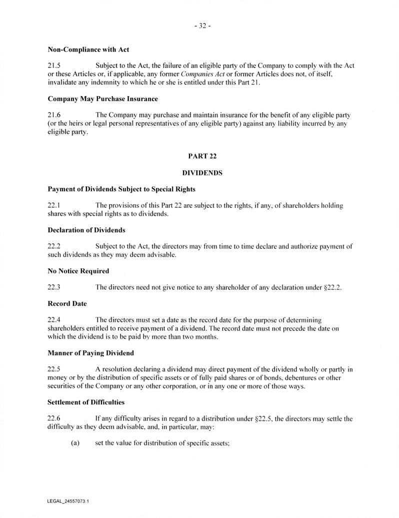 LE GA L _24557073 . 1 - 32 - Non - Compliance with Act 5. S ubj ec t t o th e A c t , th e failur e of a n e li gi bl e p a r ty o f th e Co mp a n y to co mpl y w ith t h e Ac t o r th ese Arti c l es o r , i f a ppli ca bl e, a n y fo rm e r Co mp a n ies Act o r fo rm er A r t i c l es d oes n o t , of it se l f, in va lid a t e a n y ind e mni ty t o w hi c h h e o r s h e i s e ntitl e d und e r t hi s P a rt 2 1 . Compan y Ma y Purcha se In s urance 6. Th e Co mp a n y m ay pur c h ase a nd m a in ta in in s u ra n ce fo r th e b e n e fit of a n y e li g ibl e p a r ty (o r th e h e i rs o r l ega l p e r so n a l r e pr ese nt a ti ves of a n y e li g ibl e par ty) aga in s t a n y Ii a bilit y in c urr e d b y a n y e li g ibl e p a r ty . PART22 DIVIDENDS Pa y ment of Di v idend s Subject to Special Ri g hts 1. T h e p rov i s i o n s of thi s P a t t 22 a r e s ubj ect to th e ri g h ts , i f a n y, of s h a r e h o ld e r s h o l d in g s h a r es w ith s p ec i a l ri g ht s as t o di v id e nd s . Declaration of Dividend s 2. S ubj ec t t o th e Act , th e dir ec t o r s m ay fr o m tim e t o t im e d ec l a r e a nd a uth o ri ze p ay m e n t o f s u c h di v id e nd s as t h ey m ay d ee m a d v i sa bl e. No Notic e Requir e d 3. T h e dir ec t o r s n ee d n ot g i ve n o ti ce to a n y s h a r e h o ld e r of a n y d ec l arat i on und e r † 22.2 . R e cord Date 4. T h e dir ec t o r s mu st set a d a t e as th e r eco rd d ate fo r th e purp ose of d ete rminin g s h a r e h o ld e r s e n t i t l e d t o r ece i ve p ay m e nt of a di v id e nd. T h e r eco rd d ate mu st n o t pr ece d e t h e d a t e o n w hich th e di v id e nd i s t o b e p a id b y m o r e th a n two m o nth s . Mann e r of Pa y ing Divid e nd 5. A r eso luti o n d e cl a rin g a di v id e nd m ay dir ec t p ay m e nt o f th e di v id e nd w h o ll y o r p a r t l y in m o n ey o r b y th e di s tribu t i o n of s p ec ifi c asse t s o r of fu ll y pa id s h a r es o r of b o nd s , d ebe ntur es o r ot h e r sec uriti es of t h e Co mp a n y o r a n y ot h e r co rp o rati o n , o r in a n y o n e o r m o r e of th ose ways. Settlement of Difficulties 6. I f a n y diffi c ul ty ar i ses in r ega rd t o a di st ributi o n u nd e r † 22.5, t h e dir ecto r s m ay se ttl e th e di f fi c ul ty as th ey d ee m a d v i sa bl e, a nd , in p a rti c ul a r , m ay: (a) se t t h e va lu e fo r di s tri b uti o n of s p ec ifi c asse t s ;