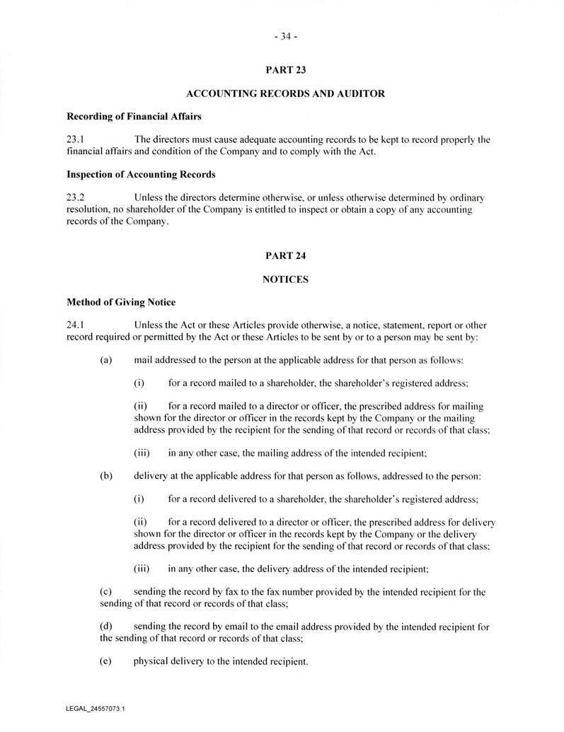 L EG A L_2 4 557073 . 1 - 34 - PART23 ACCOUNTING RECORDS AND AUDITOR Recording of Financial Affairs 1. The directors must cause adequate accounting records to be kept to record properly the financial affairs and condition of the Company and to comply with the Act. Inspection of Accounting Records 2. Unless the directors determine otherwise, or unless otherwise determined by ordinary resolution, no shareholder of the Company is entitled to inspect or obtain a copy of any accounting records of the Company. PART24 NOTICES Method of Giving Notice 1. Unless the Act or these Atticles provide otherwise, a n o ti ce , statement, report or other record required or permitted by the Act or these A rti c l es to be sent by or to a person may be sent by: (a) mail addressed to the person at the applicable address for that p e r so n as follows: (i) for a record mailed to a s h a r e h o ld e r , the shareholder's r eg i s t e r e d address; (ii) for a record mailed to a director or officer, the prescribed address for mailing shown for the director or officer in the r eco rd s kept by the Company or the m a ilin g address provided b y the recipient for the sending of that record or r eco rd s of that class; (iii) in any other case, the mailing address of the intended r ec ipi e nt ; (b) delivery at the applicable address for that person as follows, addressed to the person: (i) for a record delivered to a s h a r e h o ld e r , the shareholder's r eg i ste r e d address; (ii) for a record delivered to a director or officer, the prescribed address for delivery s h ow n for the director or officer in the records kept by the Company or the delivery address provided by the recipient for the sending of that record or records of that class; (iii) in any other case, the delivery address of the intended r ec ipi e nt ; (c) se ndin g the record by fax to the fax number provided by the intended recipient for the sending of that record or records of that c l ass ; (d) sending the record by email to the email address provided by the intended recipient for the sending of that record or records of that class; (e) physical delivery to the intended recipient.