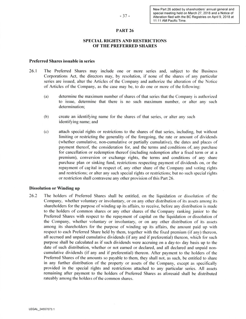 LEGAL_24 557073 . 1 - 37 - New Part 26 added by shareholders ' annual general and special meeting held on March 27 , 2018 and a Notice of Alte r ation filed with the BC Registries on April 9 , 2018 at 11 : 11 AM Pacific Time . PART 26 SPECIAL RIGHTS AND RESTRICTIONS OF THE PREFERRED SHARES Preferred Shares issuable in series 26 . 1 The Preferr e d Shares ma y include o n e o r more series and, s ubj ect t o th e Bu s in ess Co rp oratio n s Act , the dir ecto r s m ay, b y r eso luti o n , if n o n e of the s h a r es of any patti c ul a r se rie s are i ss u e d , alter th e Articles of th e Co mp a n y and authorize the alteration of th e ot i ce of Articles of the Co mpan y , as th e case m ay be , to d o one o r m ore of the fo ll ow in g : (a) det e rmin e the maximum numb e r of s har es of that se rie s th at th e Co mpan y i s authorized to i ss u e , determine that there i s no s uch maximum number , o r a l ter an y s u c h det er min a ti o n ; ( b ) create an id e nti fy in g n a m e for th e s h a r es of that se ri es , o r a lt e r any s uch id e nti fy in g n a m e ; a nd (c) attach s p ec ial ri g ht s o r r est ricti o n s t o th e s hare s of th at se ri es , in c ludin g , but without limitin g o r r es tri c tin g the ge n era li ty of the foregoing , th e r ate o r a m o unt of di v id e nd s (whether c umulati ve , n o n - c umul a ti ve or p art iall y c umul a ti ve) , the dat es a nd pla ces of pa y m e nt t h e reof , the consideration for , a nd th e term and conditions of , a n y pur c h ase for ca nc e llati o n or r e demption th e r eof (includ in g r e d e mpti o n after a fix e d t e rm or at a pr e mium) , co nver s i o n o r exc han ge rights , the term s and conditions o f any s har e pur c h ase pl a n o r s inkin g fund , r es tri ct i o n s r es pe ct in g p ay m e nt of dividends o n , o r the r e p ay m e nt of car : it a l in re p ect of , a n y ot h e r s h a r e of the Co mp a n y a nd vo tin g ri g ht s a nd r e trictions ; o r a lt er a n y s u c h s p ec i a l ri g ht s o r restriction s ; but n o s uch s pecial ri g ht s o r r estr i c ti o n s h a ll co ntra ve n e any ot h er provi s i o n of thi s Part 26 . Dissolution or Winding up 26 . 2 The hold ers of Pr eferre d S h a r es s h a ll be e ntitl e d , o n th e liquidati o n o r di sso lu tion of the Co mpan y, w h et h e r vo luntar y o r in vo lun tary , o r o n any other di tributi o n of it s assets a m o n g it s s har e h o ld e r s fo r th e purp ose of winding up it s affa ir s , t o r ece iv e , b efo r e a n y di s tribution i s m ade to th e h o ld e r s of co mmon s h a r es o r any ot h er s h a r es of the Co mp a n y r a nkin g junior to the Pr efe rr e d Shares with r es p ect to th e r epay m e nt of capital o n the liquid at i o n o r di sso luti o n of the Co mp a n y , w h et h e r vo lunt ary o r in vo lun ta r y , o r o n a n y ot h e r distribution of it s assets a m o n g it s s h a r e h o ld e r s fo r the purp ose of w indin g up it s affairs , the a m o unt p a id up w ith respect to eac h Pr efer r e d S h are h e ld b y th em , together w ith the fixed premium ( if a n y) thereon . all acc ru e d and unp a id cumulative di v idend s ( i f a n y and if pr efe r e nti a l ) th e r eo n , w hich fo r s u c h purpo se s hall b e ca lculated as if s uch divid e nd s were accruing o n a d ay - t o - da y ba s i s up t o th e dat e of s uch di st ributi o n , whether o r not ea rn e d o r d ec lar e d , a nd a ll declar e d and unpaid n o n cumu l ative di v id e nd s (if any and if pr efe r e ntial ) thereon . After pa y m e nt to the h o lder s of the Pr efe rr e d S h a r es of t h e a m o unt s so pa ya bl e to them , they s h a ll n ot , as s u c h , b e e ntitl e d to s h are in any furth er distribution of th e prop e r ty o r as ets of th e Co mp a n y, exce pt as s p ec ifi ca ll y provid e d in the s p ec ial ri g ht s and r es triction s attached to any patticular se ri es . All asse t s remainin g after payment t o the h o ld e r s of Pr efe rr e d Shares as aforesaid s h a ll be di s tribut e d rateably among the h o ld e 1 s of the co mm o n s h a r e .