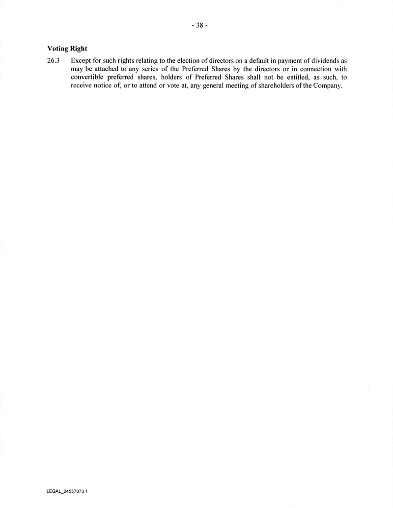LEGAL_24557073 . 1 - 38 - Voting Right 26 . 3 Except for such rights relating to the election of directors on a default in payment of dividends as may be attached to any series of the Preferred Shares by the directors or in connection with convertible preferred shares, holders of Preferred Shares shall not be entitled, as such, to receive notice of, or to attend or vote at, any general meeting of shareholders of the Company .