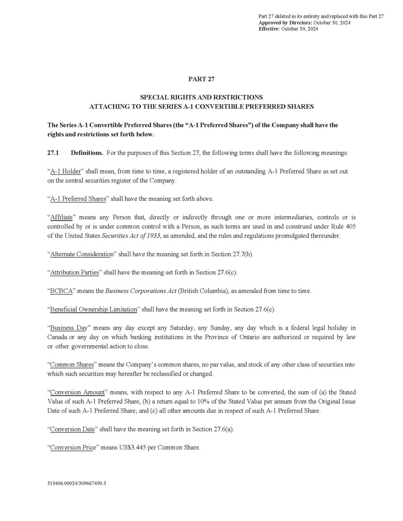 319406.00024/309667490.3 PART 27 SPECIAL RIGHTS AND RESTRICTIONS ATTACHING TO THE SERIES A - 1 CONVERTIBLE PREFERRED SHARES The Series A - 1 Convertible Preferred Shares (the “A - 1 Preferred Shares”) of the Company shall have the rights and restrictions set forth below. 27.1 Definitions. For the purposes of this Section 27, the following terms shall have the following meanings: “ A - 1 Holder ” shall mean, from time to time, a registered holder of an outstanding A - 1 Preferred Share as set out on the central securities register of the Company. “ A - 1 Preferred Shares ” shall have the meaning set forth above. “ Affiliate ” means any Person that, directly or indirectly through one or more intermediaries, controls or is controlled by or is under common control with a Person, as such terms are used in and construed under Rule 405 of the United States Securities Act of 1933 , as amended, and the rules and regulations promulgated thereunder . “ Alternate Consideratio n” shall have the meaning set forth in Section 27.7(b). “ Attribution Parties ” shall have the meaning set forth in Section 27.6(c). “ BCBCA ” means the Business Corporations Act (British Columbia), as amended from time to time. “ Beneficial Ownership Limitation ” shall have the meaning set forth in Section 27.6(c). “ Business Da y” means any day except any Saturday, any Sunday, any day which is a federal legal holiday in Canada or any day on which banking institutions in the Province of Ontario are authorized or required by law or other governmental action to close . “ Common Shares ” means the Company’s common shares, no par value, and stock of any other class of securities into which such securities may hereafter be reclassified or changed . “ Conversion Amount ” means, with respect to any A - 1 Preferred Share to be converted, the sum of (a) the Stated Value of such A - 1 Preferred Share, (b) a return equal to 10 % of the Stated Value per annum from the Original Issue Date of such A - 1 Preferred Share ; and (c) all other amounts due in respect of such A - 1 Preferred Share . “ Conversion Date ” shall have the meaning set forth in Section 27 . 6 (a) . “ Conversion Pric e” means US $ 3 . 445 per Common Share . Part 27 deleted in its entirety and replaced with this Part 27 Approved by Directors: October 30, 2024 Effective : October 30, 2024