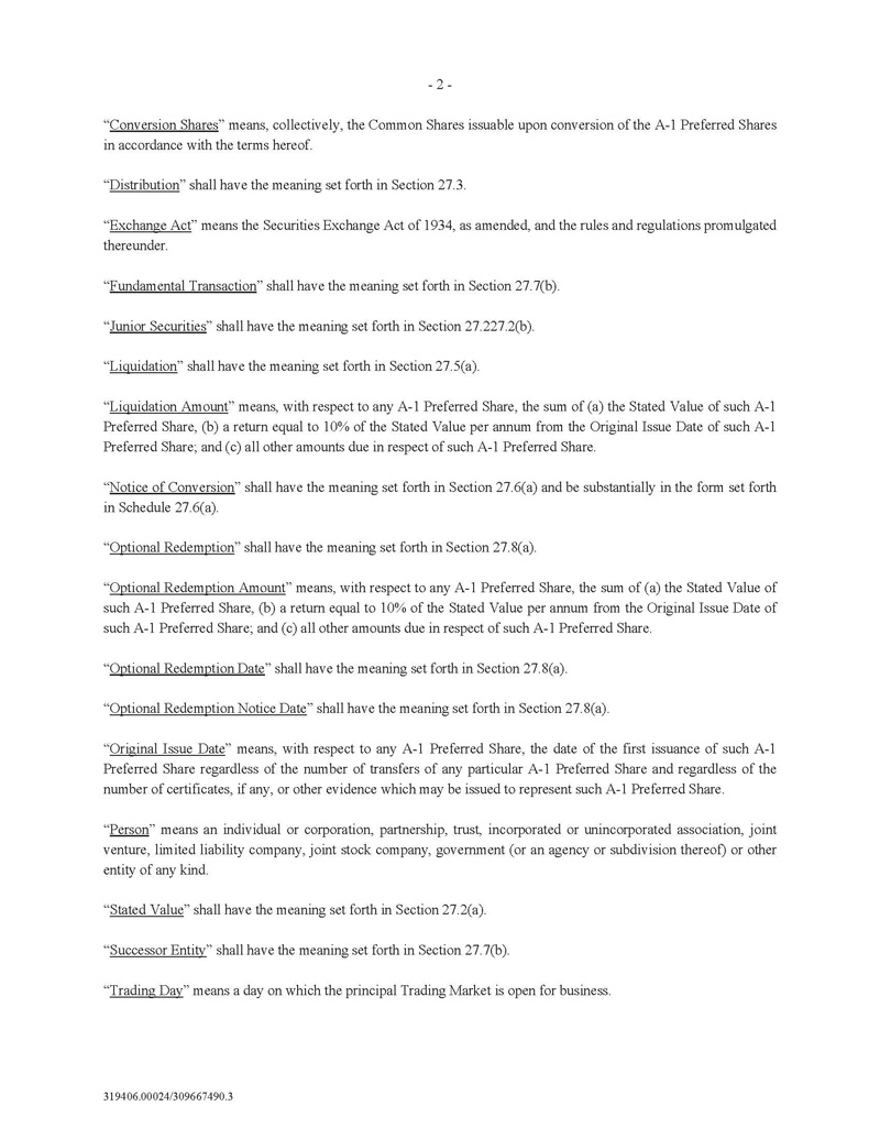 319406.00024/309667490.3 - 2 - “ Conversion Shares ” means, collectively, the Common Shares issuable upon conversion of the A - 1 Preferred Shares in accordance with the terms hereof . “ Distribution ” shall have the meaning set forth in Section 27.3. “ Exchange Act ” means the Securities Exchange Act of 1934 , as amended, and the rules and regulations promulgated thereunder . “ Fundamental Transaction ” shall have the meaning set forth in Section 27.7(b). “ Junior Securities ” shall have the meaning set forth in Section 27 . 227 . 2 (b) . “ Liquidation ” shall have the meaning set forth in Section 27 . 5 (a) . “ Liquidation Amount ” means, with respect to any A - 1 Preferred Share, the sum of (a) the Stated Value of such A - 1 Preferred Share, (b) a return equal to 10 % of the Stated Value per annum from the Original Issue Date of such A - 1 Preferred Share ; and (c) all other amounts due in respect of such A - 1 Preferred Share . “ Notice of Conversion ” shall have the meaning set forth in Section 27 . 6 (a) and be substantially in the form set forth in Schedule 27 . 6 (a) . “ Optional Redemption ” shall have the meaning set forth in Section 27.8(a). “ Optional Redemption Amount ” means, with respect to any A - 1 Preferred Share, the sum of (a) the Stated Value of such A - 1 Preferred Share, (b) a return equal to 10 % of the Stated Value per annum from the Original Issue Date of such A - 1 Preferred Share ; and (c) all other amounts due in respect of such A - 1 Preferred Share . “ Optional Redemption Date ” shall have the meaning set forth in Section 27 . 8 (a) . “ Optional Redemption Notice Date ” shall have the meaning set forth in Section 27 . 8 (a) . “ Original Issue Date ” means, with respect to any A - 1 Preferred Share, the date of the first issuance of such A - 1 Preferred Share regardless of the number of transfers of any particular A - 1 Preferred Share and regardless of the number of certificates, if any, or other evidence which may be issued to represent such A - 1 Preferred Share . “ Person ” means an individual or corporation, partnership, trust, incorporated or unincorporated association, joint venture, limited liability company, joint stock company, government (or an agency or subdivision thereof) or other entity of any kind . “ Stated Value ” shall have the meaning set forth in Section 27 . 2 (a) . “ Successor Entity ” shall have the meaning set forth in Section 27 . 7 (b) . “ Trading Day ” means a day on which the principal Trading Market is open for business.