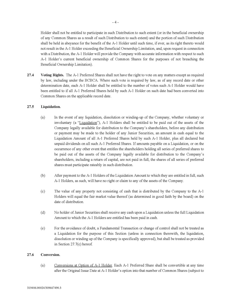 319406.00024/309667490.3 - 4 - Holder shall not be entitled to participate in such Distribution to such extent (or in the beneficial ownership of any Common Shares as a result of such Distribution to such extent) and the portion of such Distribution shall be held in abeyance for the benefit of the A - 1 Holder until such time, if ever, as its right thereto would not result in the A - 1 Holder exceeding the Beneficial Ownership Limitation, and, upon request in connection with a Distribution, the A - 1 Holder will provide the Company with accurate information with respect to such A - 1 Holder’s current beneficial ownership of Common Shares for the purposes of not breaching the Beneficial Ownership Limitation) . 4. Voting Rights . The A - 1 Preferred Shares shall not have the right to vote on any matters except as required by law, including under the BCBCA . Where such vote is required by law, as of any record date or other determination date, each A - 1 Holder shall be entitled to the number of votes such A - 1 Holder would have been entitled to if all A - 1 Preferred Shares held by such A - 1 Holder on such date had been converted into Common Shares on the applicable record date . 5. Liquidation. (a) In the event of any liquidation, dissolution or winding - up of the Company, whether voluntary or involuntary (a “ Liquidation ”), A - 1 Holders shall be entitled to be paid out of the assets of the Company legally available for distribution to the Company’s shareholders, before any distribution or payment may be made to the holder of any Junior Securities, an amount in cash equal to the Liquidation Amount of all A - 1 Preferred Shares held by such A - 1 Holder, plus all declared but unpaid dividends on all such A - 1 Preferred Shares . If amounts payable on a Liquidation, or on the occurrence of any other event that entitles the shareholders holding all series of preferred shares to be paid out of the assets of the Company legally available for distribution to the Company’s shareholders, including a return of capital, are not paid in full, the shares of all series of preferred shares must participate rateably in such distribution . (b) After payment to the A - 1 Holders of the Liquidation Amount to which they are entitled in full, such A - 1 Holders, as such, will have no right or claim to any of the assets of the Company. (c) The value of any property not consisting of cash that is distributed by the Company to the A - 1 Holders will equal the fair market value thereof (as determined in good faith by the board) on the date of distribution . (d) No holder of Junior Securities shall receive any cash upon a Liquidation unless the full Liquidation Amount to which the A - 1 Holders are entitled has been paid in cash. (e) For the avoidance of doubt, a Fundamental Transaction or change of control shall not be treated as a Liquidation for the purpose of this Section (unless in connection therewith, the liquidation, dissolution or winding up of the Company is specifically approved), but shall be treated as provided in Section 27 . 7 (c) hereof . 27.6 Conversion. (a) Conversions at Option of A - 1 Holder . Each A - 1 Preferred Share shall be convertible at any time after the Original Issue Date at A - 1 Holder’s option into that number of Common Shares (subject to
