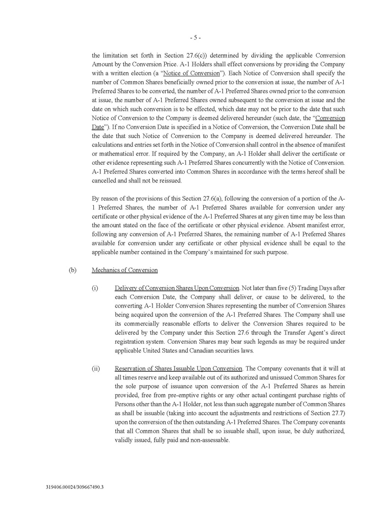 319406.00024/309667490.3 - 5 - the limitation set forth in Section 27 . 6 (c)) determined by dividing the applicable Conversion Amount by the Conversion Price . A - 1 Holders shall effect conversions by providing the Company with a written election (a “ Notice of Conversion ”) . Each Notice of Conversion shall specify the number of Common Shares beneficially owned prior to the conversion at issue, the number of A - 1 Preferred Shares to be converted, the number of A - 1 Preferred Shares owned prior to the conversion at issue, the number of A - 1 Preferred Shares owned subsequent to the conversion at issue and the date on which such conversion is to be effected, which date may not be prior to the date that such Notice of Conversion to the Company is deemed delivered hereunder (such date, the “ Conversion Date ”) . If no Conversion Date is specified in a Notice of Conversion, the Conversion Date shall be the date that such Notice of Conversion to the Company is deemed delivered hereunder . The calculations and entries set forth in the Notice of Conversion shall control in the absence of manifest or mathematical error . If required by the Company, an A - 1 Holder shall deliver the certificate or other evidence representing such A - 1 Preferred Shares concurrently with the Notice of Conversion . A - 1 Preferred Shares converted into Common Shares in accordance with the terms hereof shall be cancelled and shall not be reissued . By reason of the provisions of this Section 27 . 6 (a), following the conversion of a portion of the A - 1 Preferred Shares, the number of A - 1 Preferred Shares available for conversion under any certificate or other physical evidence of the A - 1 Preferred Shares at any given time may be less than the amount stated on the face of the certificate or other physical evidence . Absent manifest error, following any conversion of A - 1 Preferred Shares, the remaining number of A - 1 Preferred Shares available for conversion under any certificate or other physical evidence shall be equal to the applicable number contained in the Company’s maintained for such purpose . (b) Mechanics of Conversion (i) Delivery of Conversion Shares Upon Conversion . Not later than five ( 5 ) Trading Days after each Conversion Date, the Company shall deliver, or cause to be delivered, to the converting A - 1 Holder Conversion Shares representing the number of Conversion Shares being acquired upon the conversion of the A - 1 Preferred Shares . The Company shall use its commercially reasonable efforts to deliver the Conversion Shares required to be delivered by the Company under this Section 27 . 6 through the Transfer Agent’s direct registration system . Conversion Shares may bear such legends as may be required under applicable United States and Canadian securities laws . (ii) Reservation of Shares Issuable Upon Conversion . The Company covenants that it will at all times reserve and keep available out of its authorized and unissued Common Shares for the sole purpose of issuance upon conversion of the A - 1 Preferred Shares as herein provided, free from pre - emptive rights or any other actual contingent purchase rights of Persons other than the A - 1 Holder, not less than such aggregate number of Common Shares as shall be issuable (taking into account the adjustments and restrictions of Section 27 . 7 ) upon the conversion of the then outstanding A - 1 Preferred Shares . The Company covenants that all Common Shares that shall be so issuable shall, upon issue, be duly authorized, validly issued, fully paid and non - assessable .