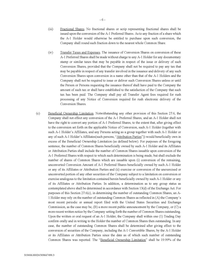 319406.00024/309667490.3 - 6 - (iii) Fractional Shares . No fractional shares or scrip representing fractional shares shall be issued upon the conversion of the A - 1 Preferred Shares . As to any fraction of a share which the A - 1 Holder would otherwise be entitled to purchase upon such conversion, the Company shall round such fraction down to the nearest whole Common Share . (iv) Transfer Taxes and Expenses . The issuance of Conversion Shares on conversion of these A - 1 Preferred Shares shall be made without charge to any A - 1 Holder for any documentary stamp or similar taxes that may be payable in respect of the issue or delivery of such Conversion Shares, provided that the Company shall not be required to pay any tax that may be payable in respect of any transfer involved in the issuance and delivery of any such Conversion Shares upon conversion in a name other than that of the A - 1 Holders and the Company shall not be required to issue or deliver such Conversion Shares unless or until the Person or Persons requesting the issuance thereof shall have paid to the Company the amount of such tax or shall have established to the satisfaction of the Company that such tax has been paid . The Company shall pay all Transfer Agent fees required for rush processing of any Notice of Conversion required for rush electronic delivery of the Conversion Shares . (c) Beneficial Ownership Limitation . Notwithstanding any other provision of this Section 27 . 6 , the Company shall not effect any conversion of the A - 1 Preferred Shares, and an A - 1 Holder shall not have the right to convert any portion of A - 1 Preferred Shares, to the extent that, after giving effect to the conversion set forth on the applicable Notice of Conversion, such A - 1 Holder (together with such A - 1 Holder’s Affiliates, and any Persons acting as a group together with such A - 1 Holder or any of such A - 1 Holder’s Affiliates(such persons, “ Attribution Parties ”)) would beneficially own in excess of the Beneficial Ownership Limitation (as defined below) . For purposes of the foregoing sentence, the number of Common Shares beneficially owned by such A - 1 Holder and its Affiliates or Attribution Parties shall include the number of Common Shares issuable upon conversion of the A - 1 Preferred Shares with respect to which such determination is being made, but shall exclude the number of shares of Common Shares which are issuable upon (i) conversion of the remaining, unconverted Conversion Amount of A - 1 Preferred Shares beneficially owned by such A - 1 Holder or any of its Affiliates or Attribution Parties and (ii) exercise or conversion of the unexercised or unconverted portion of any other securities of the Company subject to a limitation on conversion or exercise analogous to the limitation contained herein beneficially owned by such A - 1 Holder or any of its Affiliates or Attribution Parties . In addition, a determination as to any group status as contemplated above shall be determined in accordance with Section 13 (d) of the Exchange Act . For purposes of this Section 27 . 6 (c), in determining the number of outstanding Common Shares, an A - 1 Holder may rely on the number of outstanding Common Shares as reflected in (A) the Company’s most recent periodic or annual report filed with the United States Securities and Exchange Commission, as the case may be, (B) a more recent public announcement by the Company, or (C) a more recent written notice by the Company setting forth the number of Common Shares outstanding . Upon the written or oral request of an A - 1 Holder, the Company shall within one ( 1 ) Trading Day confirm orally and in writing to the Holder the number of Common Shares then outstanding . In any case, the number of outstanding Common Shares shall be determined after giving effect to the conversion of securities of the Company, including the A - 1 Convertible Shares, by the A - 1 Holder or its Affiliates or Attribution Parties since the date as of which such number of outstanding Common Shares was reported . The “ Beneficial Ownership Limitation ” shall be 19 . 99 % of the