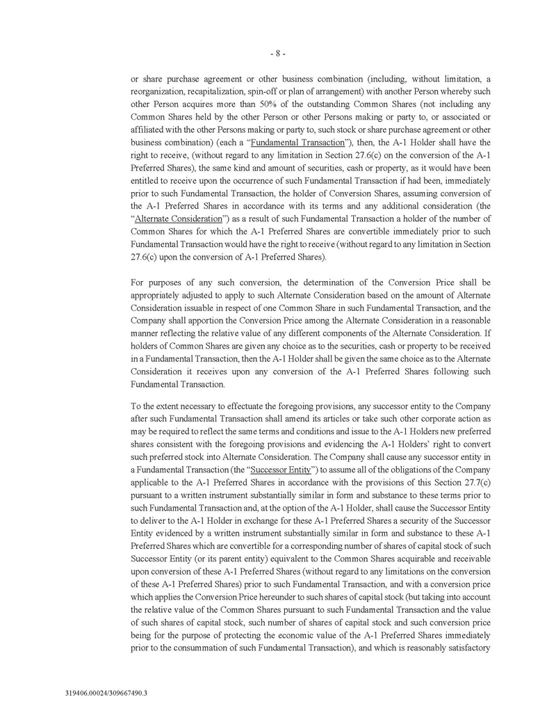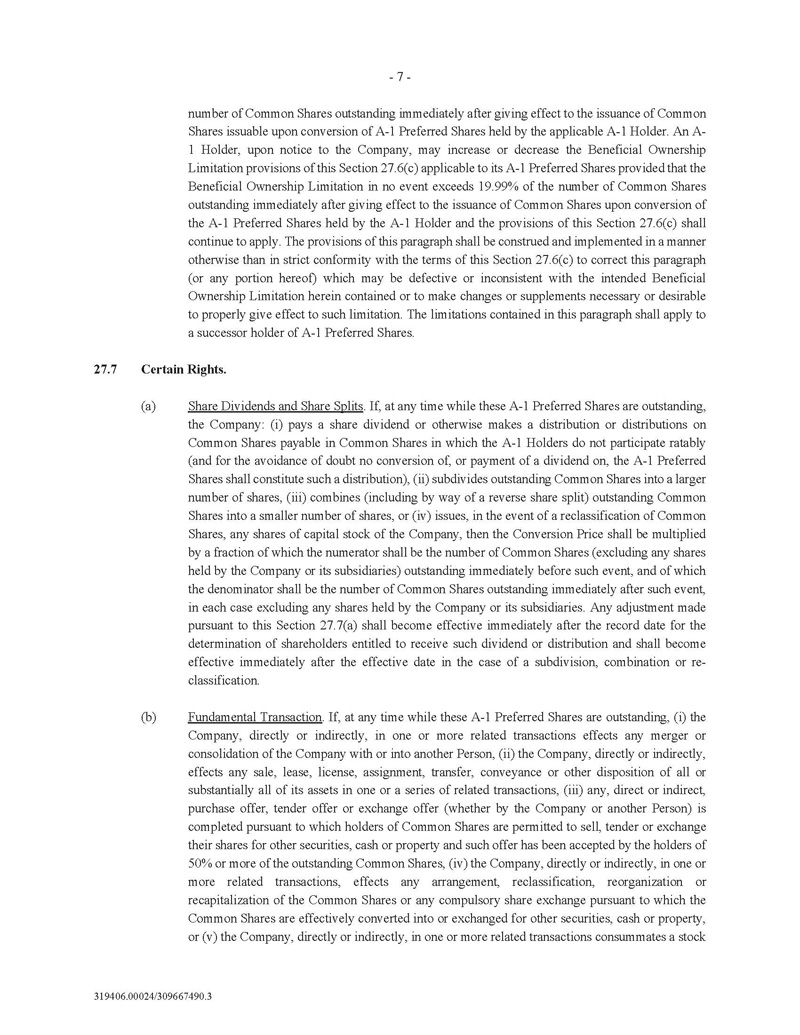 319406.00024/309667490.3 - 7 - number of Common Shares outstanding immediately after giving effect to the issuance of Common Shares issuable upon conversion of A - 1 Preferred Shares held by the applicable A - 1 Holder . An A - 1 Holder, upon notice to the Company, may increase or decrease the Beneficial Ownership Limitation provisions of this Section 27 . 6 (c) applicable to its A - 1 Preferred Shares provided that the Beneficial Ownership Limitation in no event exceeds 19 . 99 % of the number of Common Shares outstanding immediately after giving effect to the issuance of Common Shares upon conversion of the A - 1 Preferred Shares held by the A - 1 Holder and the provisions of this Section 27 . 6 (c) shall continue to apply . The provisions of this paragraph shall be construed and implemented in a manner otherwise than in strict conformity with the terms of this Section 27 . 6 (c) to correct this paragraph (or any portion hereof) which may be defective or inconsistent with the intended Beneficial Ownership Limitation herein contained or to make changes or supplements necessary or desirable to properly give effect to such limitation . The limitations contained in this paragraph shall apply to a successor holder of A - 1 Preferred Shares . 27.7 Certain Rights. (a) Share Dividends and Share Splits . If, at any time while these A - 1 Preferred Shares are outstanding, the Company : (i) pays a share dividend or otherwise makes a distribution or distributions on Common Shares payable in Common Shares in which the A - 1 Holders do not participate ratably (and for the avoidance of doubt no conversion of, or payment of a dividend on, the A - 1 Preferred Shares shall constitute such a distribution), (ii) subdivides outstanding Common Shares into a larger number of shares, (iii) combines (including by way of a reverse share split) outstanding Common Shares into a smaller number of shares, or (iv) issues, in the event of a reclassification of Common Shares, any shares of capital stock of the Company, then the Conversion Price shall be multiplied by a fraction of which the numerator shall be the number of Common Shares (excluding any shares held by the Company or its subsidiaries) outstanding immediately before such event, and of which the denominator shall be the number of Common Shares outstanding immediately after such event, in each case excluding any shares held by the Company or its subsidiaries . Any adjustment made pursuant to this Section 27 . 7 (a) shall become effective immediately after the record date for the determination of shareholders entitled to receive such dividend or distribution and shall become effective immediately after the effective date in the case of a subdivision, combination or re - classification . (b) Fundamental Transaction . If, at any time while these A - 1 Preferred Shares are outstanding, (i) the Company, directly or indirectly, in one or more related transactions effects any merger or consolidation of the Company with or into another Person, (ii) the Company, directly or indirectly, effects any sale, lease, license, assignment, transfer, conveyance or other disposition of all or substantially all of its assets in one or a series of related transactions, (iii) any, direct or indirect, purchase offer, tender offer or exchange offer (whether by the Company or another Person) is completed pursuant to which holders of Common Shares are permitted to sell, tender or exchange their shares for other securities, cash or property and such offer has been accepted by the holders of 50 % or more of the outstanding Common Shares, (iv) the Company, directly or indirectly, in one or more related transactions, effects any arrangement, reclassification, reorganization or recapitalization of the Common Shares or any compulsory share exchange pursuant to which the Common Shares are effectively converted into or exchanged for other securities, cash or property, or (v) the Company, directly or indirectly, in one or more related transactions consummates a stock