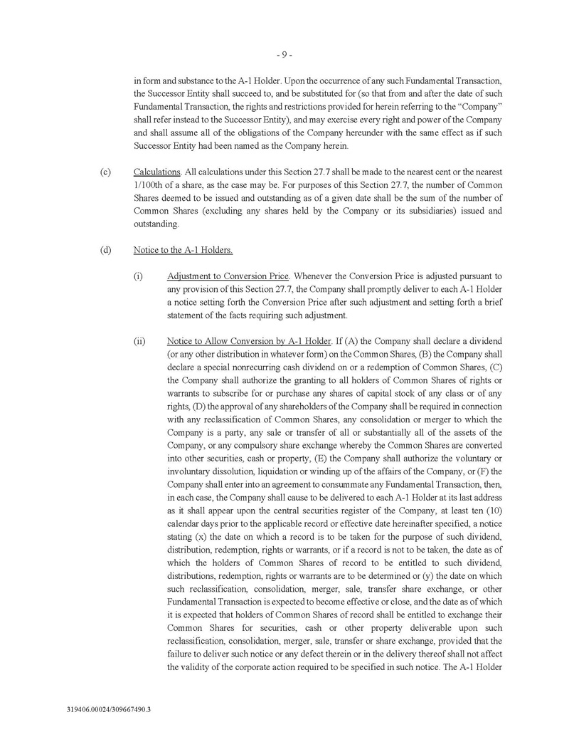319406.00024/309667490.3 - 9 - in form and substance to the A - 1 Holder . Upon the occurrence of any such Fundamental Transaction, the Successor Entity shall succeed to, and be substituted for (so that from and after the date of such Fundamental Transaction, the rights and restrictions provided for herein referring to the “Company” shall refer instead to the Successor Entity), and may exercise every right and power of the Company and shall assume all of the obligations of the Company hereunder with the same effect as if such Successor Entity had been named as the Company herein . (c) Calculations . All calculations under this Section 27 . 7 shall be made to the nearest cent or the nearest 1 / 100 th of a share, as the case may be . For purposes of this Section 27 . 7 , the number of Common Shares deemed to be issued and outstanding as of a given date shall be the sum of the number of Common Shares (excluding any shares held by the Company or its subsidiaries) issued and outstanding . (d) Notice to the A - 1 Holders. (i) Adjustment to Conversion Price . Whenever the Conversion Price is adjusted pursuant to any provision of this Section 27 . 7 , the Company shall promptly deliver to each A - 1 Holder a notice setting forth the Conversion Price after such adjustment and setting forth a brief statement of the facts requiring such adjustment . (ii) Notice to Allow Conversion by A - 1 Holder . If (A) the Company shall declare a dividend (or any other distribution in whatever form) on the Common Shares, (B) the Company shall declare a special nonrecurring cash dividend on or a redemption of Common Shares, (C) the Company shall authorize the granting to all holders of Common Shares of rights or warrants to subscribe for or purchase any shares of capital stock of any class or of any rights, (D) the approval of any shareholders of the Company shall be required in connection with any reclassification of Common Shares, any consolidation or merger to which the Company is a party, any sale or transfer of all or substantially all of the assets of the Company, or any compulsory share exchange whereby the Common Shares are converted into other securities, cash or property, (E) the Company shall authorize the voluntary or involuntary dissolution, liquidation or winding up of the affairs of the Company, or (F) the Company shall enter into an agreement to consummate any Fundamental Transaction, then, in each case, the Company shall cause to be delivered to each A - 1 Holder at its last address as it shall appear upon the central securities register of the Company, at least ten ( 10 ) calendar days prior to the applicable record or effective date hereinafter specified, a notice stating (x) the date on which a record is to be taken for the purpose of such dividend, distribution, redemption, rights or warrants, or if a record is not to be taken, the date as of which the holders of Common Shares of record to be entitled to such dividend, distributions, redemption, rights or warrants are to be determined or (y) the date on which such reclassification, consolidation, merger, sale, transfer share exchange, or other Fundamental Transaction is expected to become effective or close, and the date as of which it is expected that holders of Common Shares of record shall be entitled to exchange their Common Shares for securities, cash or other property deliverable upon such reclassification, consolidation, merger, sale, transfer or share exchange, provided that the failure to deliver such notice or any defect therein or in the delivery thereof shall not affect the validity of the corporate action required to be specified in such notice . The A - 1 Holder