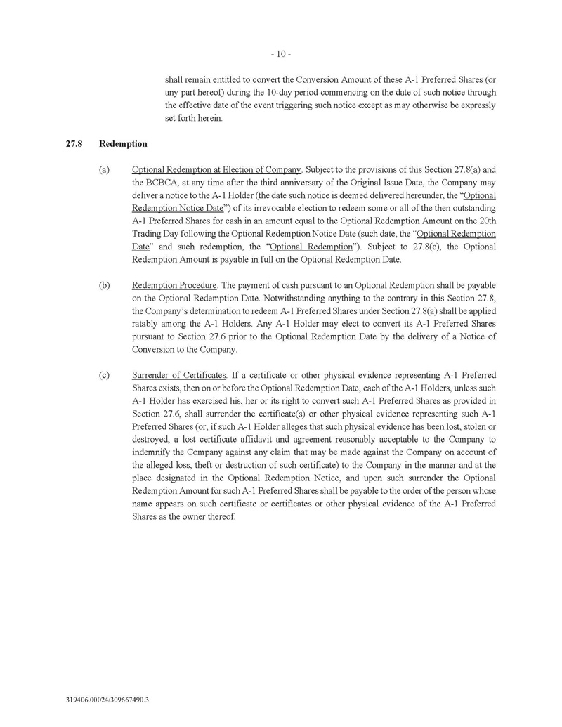 319406.00024/309667490.3 - 10 - shall remain entitled to convert the Conversion Amount of these A - 1 Preferred Shares (or any part hereof) during the 10 - day period commencing on the date of such notice through the effective date of the event triggering such notice except as may otherwise be expressly set forth herein . 27.8 Redemption (a) Optional Redemption at Election of Company . Subject to the provisions of this Section 27 . 8 (a) and the BCBCA, at any time after the third anniversary of the Original Issue Date, the Company may deliver a notice to the A - 1 Holder (the date such notice i s deemed delivered hereunder, the “ Optional Redemption Notice Date ”) of it s irrevocable election to redeem some or all of the then outstanding A - 1 Preferred Shares for cash in an amount equal to the Optional Redemption Amount on the 20 th Trading Day following the Optional Redemption Notice Date (such date, the “ Optional Redemption Date ” and such redemption, the “ Optional Redemption ”) . Subject to 27 . 8 (c), the Optional Redemption Amount i s payable in full on the Optional Redemption Date . (b) Redemption Procedure . The payment of cash pursuant to an Optional Redemption shall be payable on the Optional Redemption Date . Notwithstanding anything to the contrary in this Section 27 . 8 , the Company’s determination to redeem A - 1 Preferred Shares under Section 27 . 8 (a) shall be applied ratably among the A - 1 Holders . Any A - 1 Holder may elect to convert its A - 1 Preferred Shares pursuant to Section 27 . 6 prior to the Optional Redemption Date by the delivery of a Notice of Conversion to the Company . (c) Surrender of Certificates . If a certificate or other physical evidence representing A - 1 Preferred Shares exists, then on or before the Optional Redemption Date, each of the A - 1 Holders, unless such A - 1 Holder has exercised his, her or its right to convert such A - 1 Preferred Shares as provided in Section 27 . 6 , shall surrender the certificate(s) or other physical evidence representing such A - 1 Preferred Shares (or, if such A - 1 Holder alleges that such physical evidence has been lost, stolen or destroyed, a lost certificate affidavit and agreement reasonably acceptable to the Company to indemnify the Company against any claim that may be made against the Company on account of the alleged loss, theft or destruction of such certificate) to the Company in the manner and at the place designated in the Optional Redemption Notice, and upon such surrender the Optional Redemption Amount for such A - 1 Preferred Shares shall be payable to the order of the person whose name appears on such certificate or certificates or other physical evidence of the A - 1 Preferred Shares as the owner thereof .