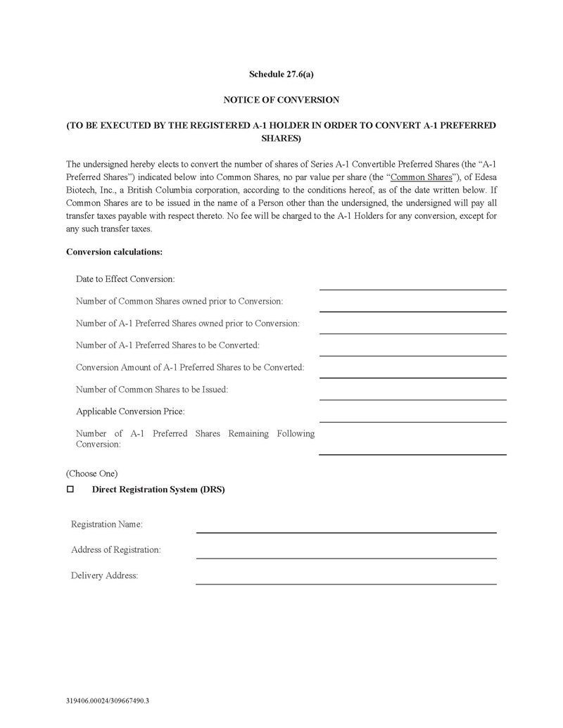 Schedule 27.6(a) NOTICE OF CONVERSION (TO BE EXECUTED BY THE REGISTERED A - 1 HOLDER IN ORDER TO CONVERT A - 1 PREFERRED SHARES) The undersigned hereby elects to convert the number of shares of Series A - 1 Convertible Preferred Shares (the “A - 1 Preferred Shares”) indicated below into Common Shares, no par value per share (the “ Common Shares ”), of Edesa Biotech, Inc . , a British Columbia corporation, according to the conditions hereof, as of the date written below . If Common Shares are to be issued in the name of a Person other than the undersigned, the undersigned will pay all transfer taxes payable with respect thereto . No fee will be charged to the A - 1 Holders for any conversion, except for any such transfer taxes . Conversion calculations : Date to Effect Conversion: Number of Common Shares owned prior to Conversion: Number of A - 1 Preferred Shares owned prior to Conversion: Number of A - 1 Preferred Shares to be Converted: Conversion Amount of A - 1 Preferred Shares to be Converted: Number of Common Shares to be Issued: Applicable Conversion Price: Number of A - 1 Preferred Shares Remaining Following Conversion: (Choose One)  Direct Registration System (DRS) Registration Name: Address of Registration: Delivery Address: 319406.00024/309667490.3