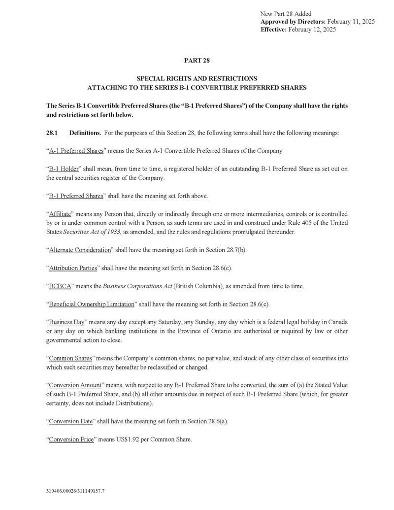 319406.00026/311149157.7 PART 28 SPECIAL RIGHTS AND RESTRICTIONS ATTACHING TO THE SERIES B - 1 CONVERTIBLE PREFERRED SHARES The Series B - 1 Convertible Preferred Shares (the “B - 1 Preferred Shares”) of the Company shall have the rights and restrictions set forth below. 28.1 Definitions. For the purposes of this Section 28, the following terms shall have the following meanings: “ A - 1 Preferred Shares ” means the Series A - 1 Convertible Preferred Shares of the Company. “ B - 1 Holder ” shall mean, from time to time, a registered holder of an outstanding B - 1 Preferred Share as set out on the central securities register of the Company. “ B - 1 Preferred Shares ” shall have the meaning set forth above. “ Affiliate ” means any Person that, directly or indirectly through one or more intermediaries, controls or is controlled by or is under common control with a Person, as such terms are used in and construed under Rule 405 of the United States Securities Act of 1933 , as amended, and the rules and regulations promulgated thereunder . “ Alternate Consideration ” shall have the meaning set forth in Section 28 . 7 (b) . “ Attribution Parties ” shall have the meaning set forth in Section 28 . 6 (c) . “ BCBCA ” means the Business Corporations Act (British Columbia), as amended from time to time. “ Beneficial Ownership Limitation ” shall have the meaning set forth in Section 28.6(c). “ Business Day ” means any day except any Saturday, any Sunday, any day which is a federal legal holiday in Canada or any day on which banking institutions in the Province of Ontario are authorized or required by law or other governmental action to close . “ Common Shares ” means the Company’s common shares, no par value, and stock of any other class of securities into which such securities may hereafter be reclassified or changed . “ Conversion Amount ” means, with respect to any B - 1 Preferred Share to be converted, the sum of (a) the Stated Value of such B - 1 Preferred Share, and (b) all other amounts due in respect of such B - 1 Preferred Share (which, for greater certainty, does not include Distributions) . “ Conversion Date ” shall have the meaning set forth in Section 28 . 6 (a) . “ Conversion Price ” means US $ 1 . 92 per Common Share . New Part 28 Added Approved by Directors: February 11, 2025 Effective: February 12, 2025