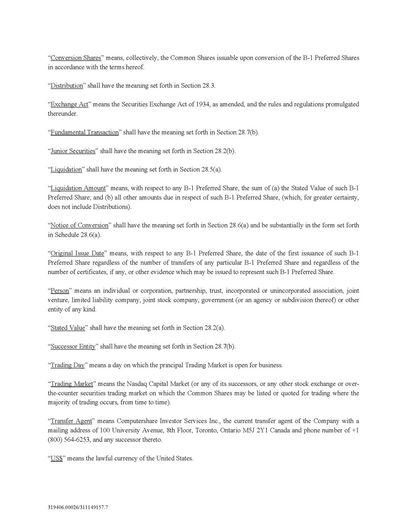 319406.00026/311149157.7 “ Conversion Shares ” means, collectively, the Common Shares issuable upon conversion of the B - 1 Preferred Shares in accordance with the terms hereof. “ Distribution ” shall have the meaning set forth in Section 28.3. “ Exchange Act ” means the Securities Exchange Act of 1934, as amended, and the rules and regulations promulgated thereunder. “ Fundamental Transaction ” shall have the meaning set forth in Section 28.7(b). “ Junior Securities ” shall have the meaning set forth in Section 28.2(b). “ Liquidation ” shall have the meaning set forth in Section 28.5(a). “ Liquidation Amount ” means, with respect to any B - 1 Preferred Share, the sum of (a) the Stated Value of such B - 1 Preferred Share ; and (b) all other amounts due in respect of such B - 1 Preferred Share, (which, for greater certainty, does not include Distributions) . “ Notice of Conversion ” shall have the meaning set forth in Section 28 . 6 (a) and be substantially in the form set forth in Schedule 28 . 6 (a) . “ Original Issue Date ” means, with respect to any B - 1 Preferred Share, the date of the first issuance of such B - 1 Preferred Share regardless of the number of transfers of any particular B - 1 Preferred Share and regardless of the number of certificates, if any, or other evidence which may be issued to represent such B - 1 Preferred Share . “ Person ” means an individual or corporation, partnership, trust, incorporated or unincorporated association, joint venture, limited liability company, joint stock company, government (or an agency or subdivision thereof) or other entity of any kind . “ Stated Value ” shall have the meaning set forth in Section 28 . 2 (a) . “ Successor Entity ” shall have the meaning set forth in Section 28 . 7 (b) . “ Trading Day ” means a day on which the principal Trading Market is open for business. “ Trading Market ” means the Nasdaq Capital Market (or any of its successors, or any other stock exchange or over - the - counter securities trading market on which the Common Shares may be listed or quoted for trading where the majority of trading occurs, from time to time) . “ Transfer Agent ” means Computershare Investor Services Inc . , the current transfer agent of the Company with a mailing address of 100 University Avenue, 8 th Floor, Toronto, Ontario M 5 J 2 Y 1 Canada and phone number of + 1 ( 800 ) 564 - 6253 , and any successor thereto . “ US$ ” means the lawful currency of the United States.
