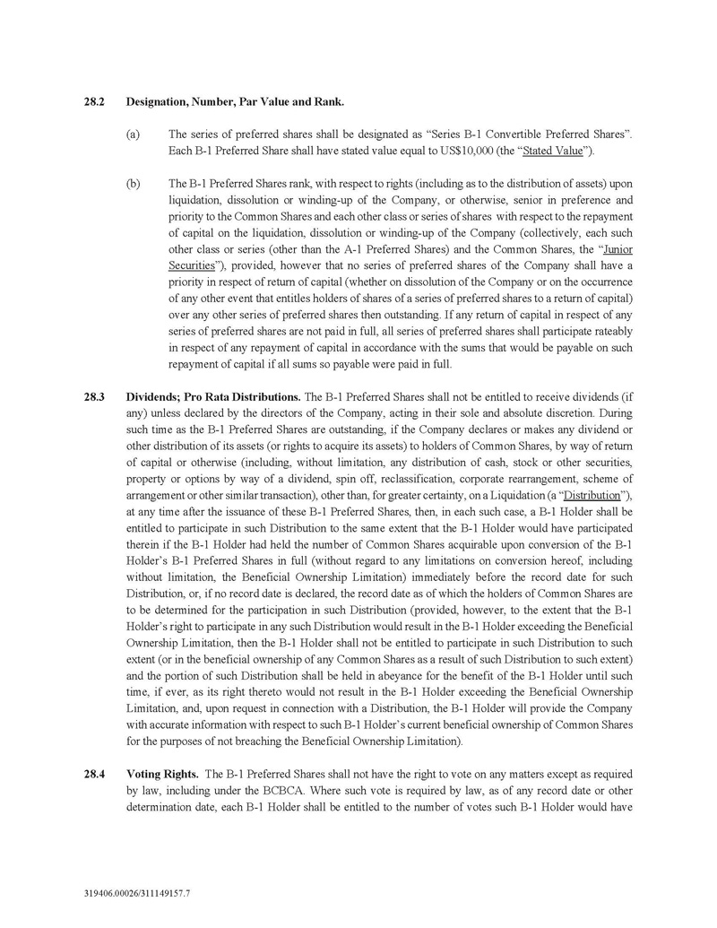 319406.00026/311149157.7 28.2 Designation, Number, Par Value and Rank. (a) The series of preferred shares shall be designated as “Series B - 1 Convertible Preferred Shares”. Each B - 1 Preferred Share shall have stated value equal to US$10,000 (the “ Stated Value ”). (b) The B - 1 Preferred Shares rank, with respect to rights (including as to the distribution of assets) upon liquidation, dissolution or winding - up of the Company, or otherwise, senior in preference and priority to the Common Shares and each other class or series of shares with respect to the repayment of capital on the liquidation, dissolution or winding - up of the Company (collectively, each such other class or series (other than the A - 1 Preferred Shares) and the Common Shares, the “ Junior Securities ”), provided, however that no series of preferred shares of the Company shall have a priority in respect of return of capital (whether on dissolution of the Company or on the occurrence of any other event that entitles holders of shares of a series of preferred shares to a return of capital) over any other series of preferred shares then outstanding . If any return of capital in respect of any series of preferred shares are not paid in full, all series of preferred shares shall participate rateably in respect of any repayment of capital in accordance with the sums that would be payable on such repayment of capital if all sums so payable were paid in full . 3. Dividends ; Pro Rata Distributions . The B - 1 Preferred Shares shal l not be entitle d t o receive div i dend s (if any) unles s declared b y the directors of the Company , acting i n their sole and absolute discretion . During such time as the B - 1 Preferred Shares are outst a nd i ng, if the Company declares or makes any dividend or other distr i but i on of its assets (or rights to acquire its assets) to holders of Com m on Shares, by way of return of capital or otherwise (including , withou t limitation , any distr i bution of cash, stock or other securities, property or options by way of a dividend, sp i n off, reclassification, corporate rearrangement, scheme of arrangement or other simila r transaction), other than, for greater certainty, o n a Liquidatio n (a “ Distribution ”), at any time after the issuance of these B - 1 Preferred Shares, then, in each such case, a B - 1 Holder s hall be entitle d t o participate i n such Distributio n to the same extent that the B - 1 Holder would have participated therein if the B - 1 Holder had held the number of C o mmo n Shares acquirable up on conversion of the B - 1 Holder’s B - 1 Preferred Shares i n full (wi t hou t regard to any limitati o n s o n conversion hereof, i n clu d ing withou t limitation , the Beneficial Ownership Limitation ) imm e diatel y before the record date for such Distribution , or, if n o record date i s declared, the record date as of which the holder s of Commo n Shares are t o be determined for the participation i n such Distrib u tio n (provided, however, t o the extent that the B - 1 Holder’s right to participate i n any such Distributio n woul d result i n the B - 1 Holder exceeding the Beneficial Ownership L i mitation , then the B - 1 Holder shall not be entitle d t o participate i n such Distributio n t o such extent (or in the beneficial ownership of any Com m on Shares as a result of such Distribution to such extent) and the portio n of such Distributio n shal l be hel d i n abeyance for the benefit of the B - 1 Holder unti l such time , if ever, as it s right thereto woul d not result i n the B - 1 Holder exceeding the Beneficial Ownership Limitation , and, upo n request i n connection wit h a Distribution , the B - 1 Holder wil l provide the C o mpany wit h accurate information wit h respect to such B - 1 Holder’s current beneficial ownership of Com m on Shares for the purposes of no t breaching the Beneficial Ownership Limitation) . 4. Voting Rights . The B - 1 Preferred Shares shall not have the right to vote on any matters except as required by law, including under the BCBCA . Where such vote is required by law, as of any record date or other determination date, each B - 1 Holder shall be entitled to the number of votes such B - 1 Holder would have
