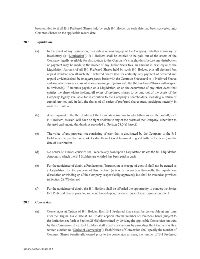 319406.00026/311149157.7 been entitled to if all B - 1 Preferred Shares held by such B - 1 Holder on such date had been converted into Common Shares on the applicable record date. 28.5 Liquidation. (a) In the event of any liquidation, dissolution or winding - up of the Company, whether voluntary or involuntary (a “ Liquidation ”), B - 1 Holders shall be entitled to be paid out of the assets of the Company legally available for distribution to the Company’s shareholders, before any distribution or payment may be made to the holder of any Junior Securities, an amount in cash equal to the Liquidation Amount of all B - 1 Preferred Shares held by such B - 1 Holder, plus all declared but unpaid dividends on all such B - 1 Preferred Shares (but for certainty, any payment of declared and unpaid dividends shall be on a pari passu basis with the Common Shares and A - 1 Preferred Shares and any other series or class of shares ranking pari passu with the B - 1 Preferred Shares with respect to dividends) . If amounts payable on a Liquidation, or on the occurrence of any other event that entitles the shareholders holding all series of preferred shares to be paid out of the assets of the Company legally available for distribution to the Company’s shareholders, including a return of capital, are not paid in full, the shares of all series of preferred shares must participate rateably in such distribution . (b) After payment to the B - 1 Holders of the Liquidation Amount to which they are entitled in full, such B - 1 Holders, as such, will have no right or claim to any of the assets of the Company, other than to declared and unpaid dividends as provided in Section 28 . 5 (a) hereof . (c) The value of any property not consisting of cash that is distributed by the Company to the B - 1 Holders will equal the fair market value thereof (as determined in good faith by the board) on the date of distribution . (d) No holder of Junior Securities shall receive any cash upon a Liquidation unless the full Liquidation Amount to which the B - 1 Holders are entitled has been paid in cash. (e) For the avoidance of doubt, a Fundamental Transaction or change of control shall not be treated as a Liquidation for the purpose of this Section (unless in connection therewith, the liquidation, dissolution or winding up of the Company is specifically approved), but shall be treated as provided in Section 28 . 7 (b) hereof . (f) For the avoidance of doubt, the B - 1 Holders shall be afforded the opportunity to convert the Series B - 1 Preferred Shares prior to, and conditioned upon, the occurrence of any Liquidation Event. 28.6 Conversion. (a) Conversions at Option of B - 1 Holder . Each B - 1 Preferred Share shall be convertible at any time after the Original Issue Date at B - 1 Holder’s option into that number of Common Shares (subject to the limitation set forth in Section 28 . 6 (c) determined by dividing the applicable Conversion Amount by the Conversion Price . B - 1 Holders shall effect conversions by providing the Company with a written election (a “ Notice of Conversion ”) . Each Notice of Conversion shall specify the number of Common Shares beneficially owned prior to the conversion at issue, the number of B - 1 Preferred
