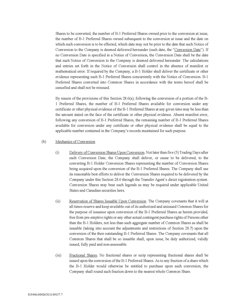 319406.00026/311149157.7 Shares to be converted, the number of B - 1 Preferred Shares owned prior to the conversion at issue, the number of B - 1 Preferred Shares owned subsequent to the conversion at issue and the date on which such conversion is to be effected, which date may not be prior to the date that such Notice of Conversion to the Company is deemed delivered hereunder (such date, the “ Conversion Date ”) . If no Conversion Date is specified in a Notice of Conversion, the Conversion Date shall be the date that such Notice of Conversion to the Company is deemed delivered hereunder . The calculations and entries set forth in the Notice of Conversion shall control in the absence of manifest or mathematical error . If required by the Company, a B - 1 Holder shall deliver the certificate or other evidence representing such B - 1 Preferred Shares concurrently with the Notice of Conversion . B - 1 Preferred Shares converted into Common Shares in accordance with the terms hereof shall be cancelled and shall not be reissued . By reason of the provisions of this Section 28 . 6 (a), following the conversion of a portion of the B - 1 Preferred Shares, the number of B - 1 Preferred Shares available for conversion under any certificate or other physical evidence of the B - 1 Preferred Shares at any given time may be less than the amount stated on the face of the certificate or other physical evidence . Absent manifest error, following any conversion of B - 1 Preferred Shares, the remaining number of B - 1 Preferred Shares available for conversion under any certificate or other physical evidence shall be equal to the applicable number contained in the Company’s records maintained for such purpose . (b) Mechanics of Conversion (i) Delivery of Conversion Shares Upon Conversion . Not later than five ( 5 ) Trading Days after each Conversion Date, the Company shall deliver, or cause to be delivered, to the converting B - 1 Holder Conversion Shares representing the number of Conversion Shares being acquired upon the conversion of the B - 1 Preferred Shares . The Company shall use its reasonable best efforts to deliver the Conversion Shares required to be delivered by the Company under this Section 28 . 6 through the Transfer Agent’s direct registration system . Conversion Shares may bear such legends as may be required under applicable United States and Canadian securities laws . (ii) Reservation of Shares Issuable Upon Conversion . The Company covenants that it will at all times reserve and keep available out of its authorized and unissued Common Shares for the purpose of issuance upon conversion of the B - 1 Preferred Shares as herein provided, free from pre - emptive rights or any other actual contingent purchase rights of Persons other than the B - 1 Holders, not less than such aggregate number of Common Shares as shall be issuable (taking into account the adjustments and restrictions of Section 28 . 7 ) upon the conversion of the then outstanding B - 1 Preferred Shares . The Company covenants that all Common Shares that shall be so issuable shall, upon issue, be duly authorized, validly issued, fully paid and non - assessable . (iii) Fractional Shares . No fractional shares or scrip representing fractional shares shall be issued upon the conversion of the B - 1 Preferred Shares . As to any fraction of a share which the B - 1 Holder would otherwise be entitled to purchase upon such conversion, the Company shall round such fraction down to the nearest whole Common Share .