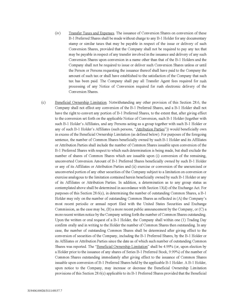 319406.00026/311149157.7 (iv) Transfer Taxes and Expenses . The issuance of Conversion Shares on conversion of these B - 1 Preferred Shares shall be made without charge to any B - 1 Holder for any documentary stamp or similar taxes that may be payable in respect of the issue or delivery of such Conversion Shares, provided that the Company shall not be required to pay any tax that may be payable in respect of any transfer involved in the issuance and delivery of any such Conversion Shares upon conversion in a name other than that of the B - 1 Holders and the Company shall not be required to issue or deliver such Conversion Shares unless or until the Person or Persons requesting the issuance thereof shall have paid to the Company the amount of such tax or shall have established to the satisfaction of the Company that such tax has been paid . The Company shall pay all Transfer Agent fees required for rush processing of any Notice of Conversion required for rush electronic delivery of the Conversion Shares . (c) Beneficial Ownership Limitation . Notwithstanding any other provision of this Section 28 . 6 , the Company shall not effect any conversion of the B - 1 Preferred Shares, and a B - 1 Holder shall not have the right to convert any portion of B - 1 Preferred Shares, to the extent that, after giving effect to the conversion set forth on the applicable Notice of Conversion, such B - 1 Holder (together with such B - 1 Holder’s Affiliates, and any Persons acting as a group together with such B - 1 Holder or any of such B - 1 Holder’s Affiliates (such persons, “ Attribution Parties ”)) would beneficially own in excess of the Beneficial Ownership Limitation (as defined below) . For purposes of the foregoing sentence, the number of Common Shares beneficially owned by such B - 1 Holder and its Affiliates or Attribution Parties shall include the number of Common Shares issuable upon conversion of the B - 1 Preferred Shares with respect to which such determination is being made, but shall exclude the number of shares of Common Shares which are issuable upon (i) conversion of the remaining, unconverted Conversion Amount of B - 1 Preferred Shares beneficially owned by such B - 1 Holder or any of its Affiliates or Attribution Parties and (ii) exercise or conversion of the unexercised or unconverted portion of any other securities of the Company subject to a limitation on conversion or exercise analogous to the limitation contained herein beneficially owned by such B - 1 Holder or any of its Affiliates or Attribution Parties . In addition, a determination as to any group status as contemplated above shall be determined in accordance with Section 13 (d) of the Exchange Act . For purposes of this Section 28 . 6 (c), in determining the number of outstanding Common Shares, a B - 1 Holder may rely on the number of outstanding Common Shares as reflected in (A) the Company’s most recent periodic or annual report filed with the United States Securities and Exchange Commission, as the case may be, (B) a more recent public announcement by the Company, or (C) a more recent written notice by the Company setting forth the number of Common Shares outstanding . Upon the written or oral request of a B - 1 Holder, the Company shall within one ( 1 ) Trading Day confirm orally and in writing to the Holder the number of Common Shares then outstanding . In any case, the number of outstanding Common Shares shall be determined after giving effect to the conversion of securities of the Company, including the B - 1 Preferred Shares, by the B - 1 Holder or its Affiliates or Attribution Parties since the date as of which such number of outstanding Common Shares was reported . The “ Beneficial Ownership Limitation ” shall be 4 . 99 % (or, upon election by a Holder prior to the issuance of any shares of Series B - 1 Preferred Stock, 9 . 99 % ) of the number of Common Shares outstanding immediately after giving effect to the issuance of Common Shares issuable upon conversion of B - 1 Preferred Shares held by the applicable B - 1 Holder . A B - 1 Holder, upon notice to the Company, may increase or decrease the Beneficial Ownership Limitation provisions of this Section 28 . 6 (c) applicable to its B - 1 Preferred Shares provided that the Beneficial