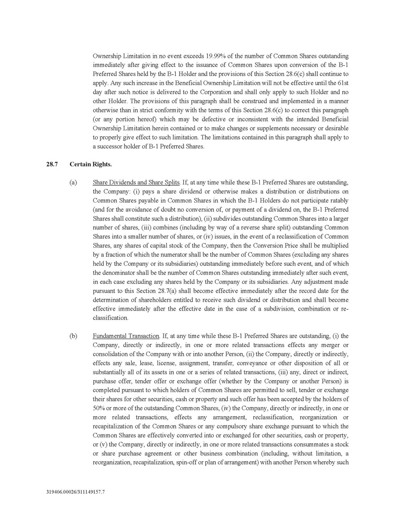 319406.00026/311149157.7 Ownership Limitation in no event exceeds 19 . 99 % of the number of Common Shares outstanding immediately after giving effect to the issuance of Common Shares upon conversion of the B - 1 Preferred Shares held by the B - 1 Holder and the provisions of this Section 28 . 6 (c) shall continue to apply . Any such increase in the Beneficial Ownership Limitation will not be effective until the 61 st day after such notice is delivered to the Corporation and shall only apply to such Holder and no other Holder . The provisions of this paragraph shall be construed and implemented in a manner otherwise than in strict conformity with the terms of this Section 28 . 6 (c) to correct this paragraph (or any portion hereof) which may be defective or inconsistent with the intended Beneficial Ownership Limitation herein contained or to make changes or supplements necessary or desirable to properly give effect to such limitation . The limitations contained in this paragraph shall apply to a successor holder of B - 1 Preferred Shares . 28.7 Certain Rights. (a) Share Dividends and Share Splits . If, at any time while these B - 1 Preferred Shares are outstanding, the Company : (i) pays a share dividend or otherwise makes a distribution or distributions on Common Shares payable in Common Shares in which the B - 1 Holders do not participate ratably (and for the avoidance of doubt no conversion of, or payment of a dividend on, the B - 1 Preferred Shares shall constitute such a distribution), (ii) subdivides outstanding Common Shares into a larger number of shares, (iii) combines (including by way of a reverse share split) outstanding Common Shares into a smaller number of shares, or (iv) issues, in the event of a reclassification of Common Shares, any shares of capital stock of the Company, then the Conversion Price shall be multiplied by a fraction of which the numerator shall be the number of Common Shares (excluding any shares held by the Company or its subsidiaries) outstanding immediately before such event, and of which the denominator shall be the number of Common Shares outstanding immediately after such event, in each case excluding any shares held by the Company or its subsidiaries . Any adjustment made pursuant to this Section 28 . 7 (a) shall become effective immediately after the record date for the determination of shareholders entitled to receive such dividend or distribution and shall become effective immediately after the effective date in the case of a subdivision, combination or re - classification . (b) Fundamental Transaction . If, at any time while these B - 1 Preferred Shares are outstanding, (i) the Company, directly or indirectly, in one or more related transactions effects any merger or consolidation of the Company with or into another Person, (ii) the Company, directly or indirectly, effects any sale, lease, license, assignment, transfer, conveyance or other disposition of all or substantially all of its assets in one or a series of related transactions, (iii) any, direct or indirect, purchase offer, tender offer or exchange offer (whether by the Company or another Person) is completed pursuant to which holders of Common Shares are permitted to sell, tender or exchange their shares for other securities, cash or property and such offer has been accepted by the holders of 50 % or more of the outstanding Common Shares, (iv) the Company, directly or indirectly, in one or more related transactions, effects any arrangement, reclassification, reorganization or recapitalization of the Common Shares or any compulsory share exchange pursuant to which the Common Shares are effectively converted into or exchanged for other securities, cash or property, or (v) the Company, directly or indirectly, in one or more related transactions consummates a stock or share purchase agreement or other business combination (including, without limitation, a reorganization, recapitalization, spin - off or plan of arrangement) with another Person whereby such